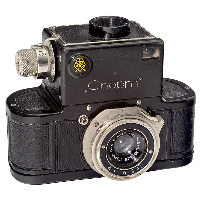 GOMZ, Leningrad, USSR. SLR camera for 24 x 36 mm film in special cartridges. Focal plane shutter 1/25–1/500 sec., stuck. Industar 10 3,5/5 cm, no. 1329, with black aperture scale. Backplate interlock mechanism damaged. With original case.