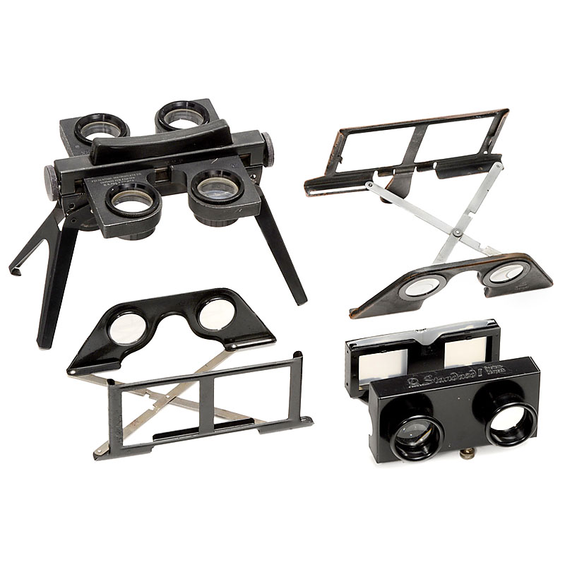 1) Felsenthal Instruments Co. Table viewer with 2 stereo lens pairs (2x and 4x). – 2) System Derpsch. Standard I, for size 45 x 107 mm. – 3) Raumbild-Verlag. Stereo viewer for cards 6 x 13 cm. – And: 4) Unmarked stereo viewer for cards with size 6 x 13 cm