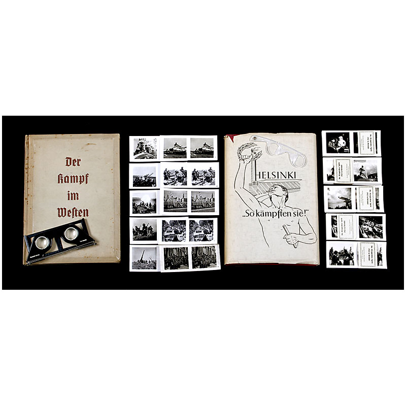 1) "Der Kampf im Westen", 1940. Raumbild-Verlag Otto Schönstein, Munich. 75 pages, 7 plates, complete with 100 cards and viewer. (3/–) – And: 2) "Helsinki. So kämpften sie!", with 100 cards and viewer. (3/–)