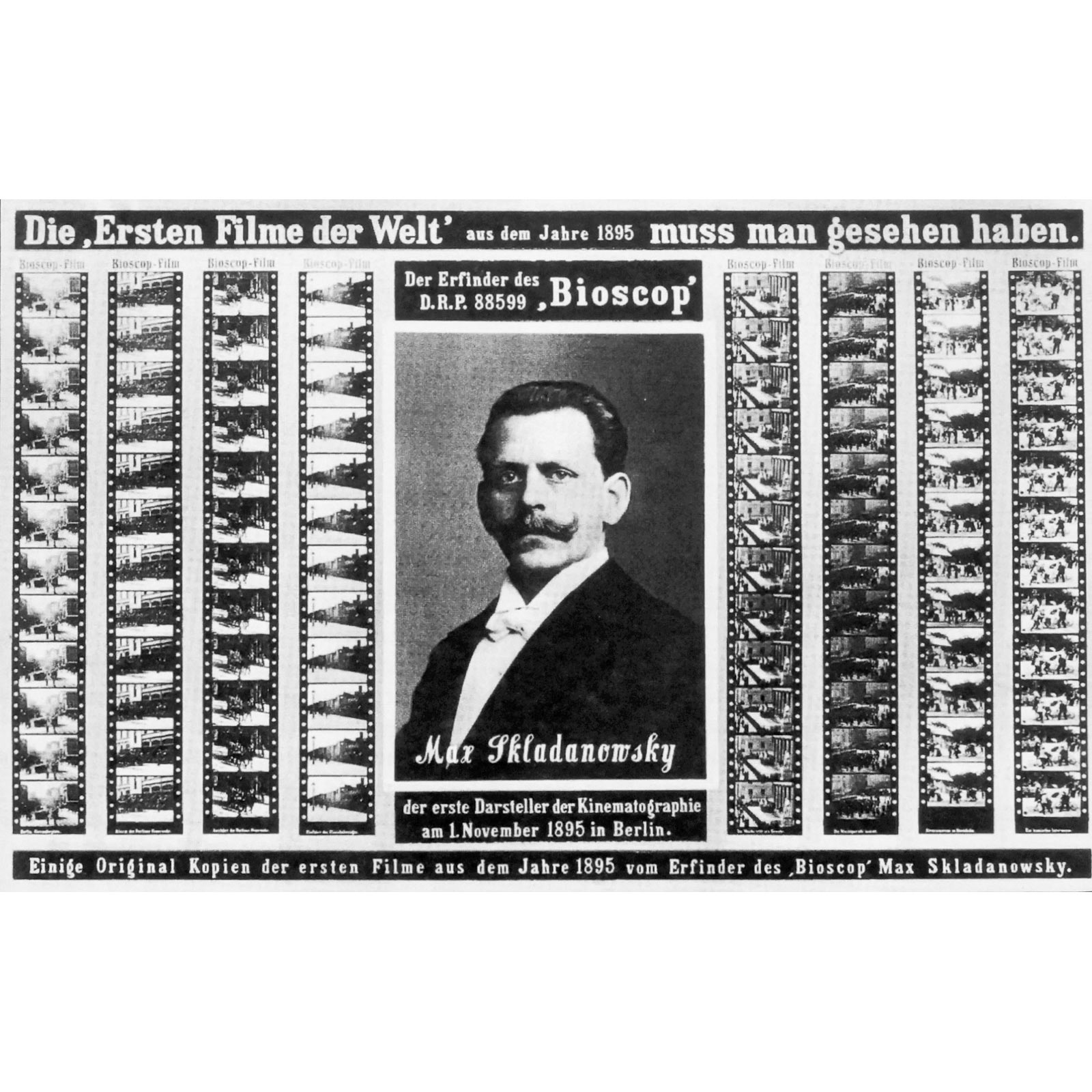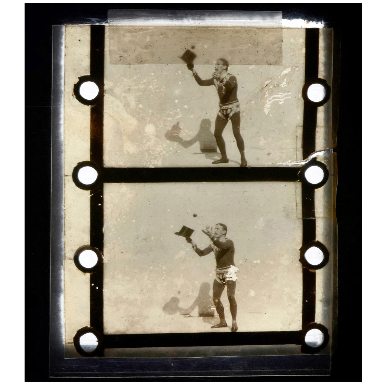 A strip of 35mm film with two stills showing the juggler Paul Petras (film perforations reinforced with shoe-lace eyelets), in glazed frame. The first public film projection took place in the Wintergarten music hall, Berlin, on 1 November 1895. The showman Max Skladanowsky invented a camera, projector and his own film format and filmed international entertainers against a white screen. The 15-minute performance of moving photographs created a sensation. Skladanowsky presented among others the vaudeville juggler Paul Petras, whom he had filmed in May 1895 in outlying Berlin district Pankow. An important piece of early film history appearing at auction for the first time!