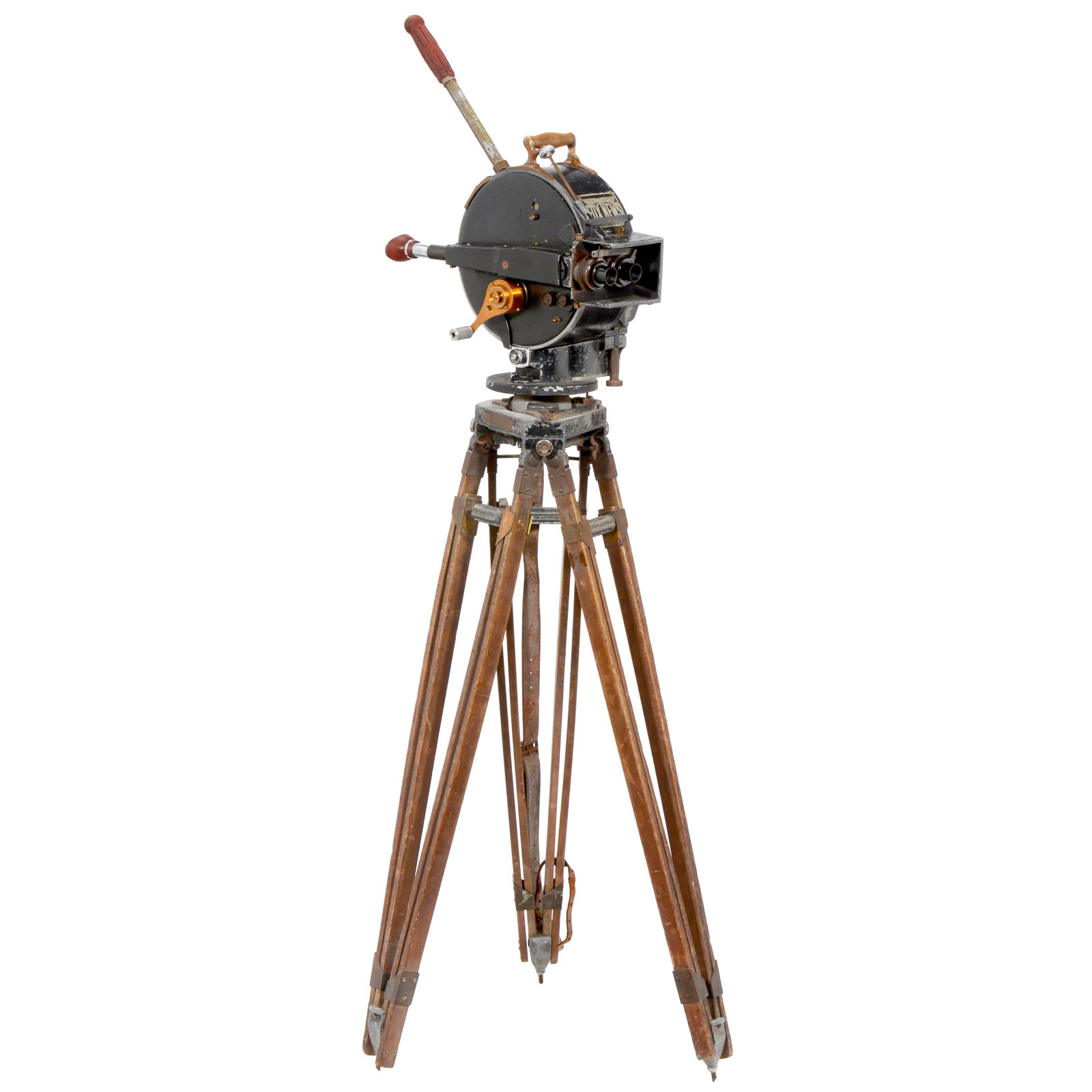 Akeley Camera Inc., USA. No. 192, 35 mm equipment, camera for 60 m internal magazines (1 included), interchangeable lens system, taking and viewfinder lenses mounted together on 1 plate, camera with Zeiss Jena 1:3,5/5 cm lens, 4 additional lens sets in suitcase: Tessar 3,5/10,5 cm, Bausch & Lomb Tessar 4 x 5, Dallmeyer Telephoto Lens Dallon F=12 and Tessar 3,5/21 cm. Handcrank and electric motor drive, original Akeley gyro-tripod head. Special feature: "Fox News Mightiest of All" owner plaque on camera and case. Some damage to lenses.