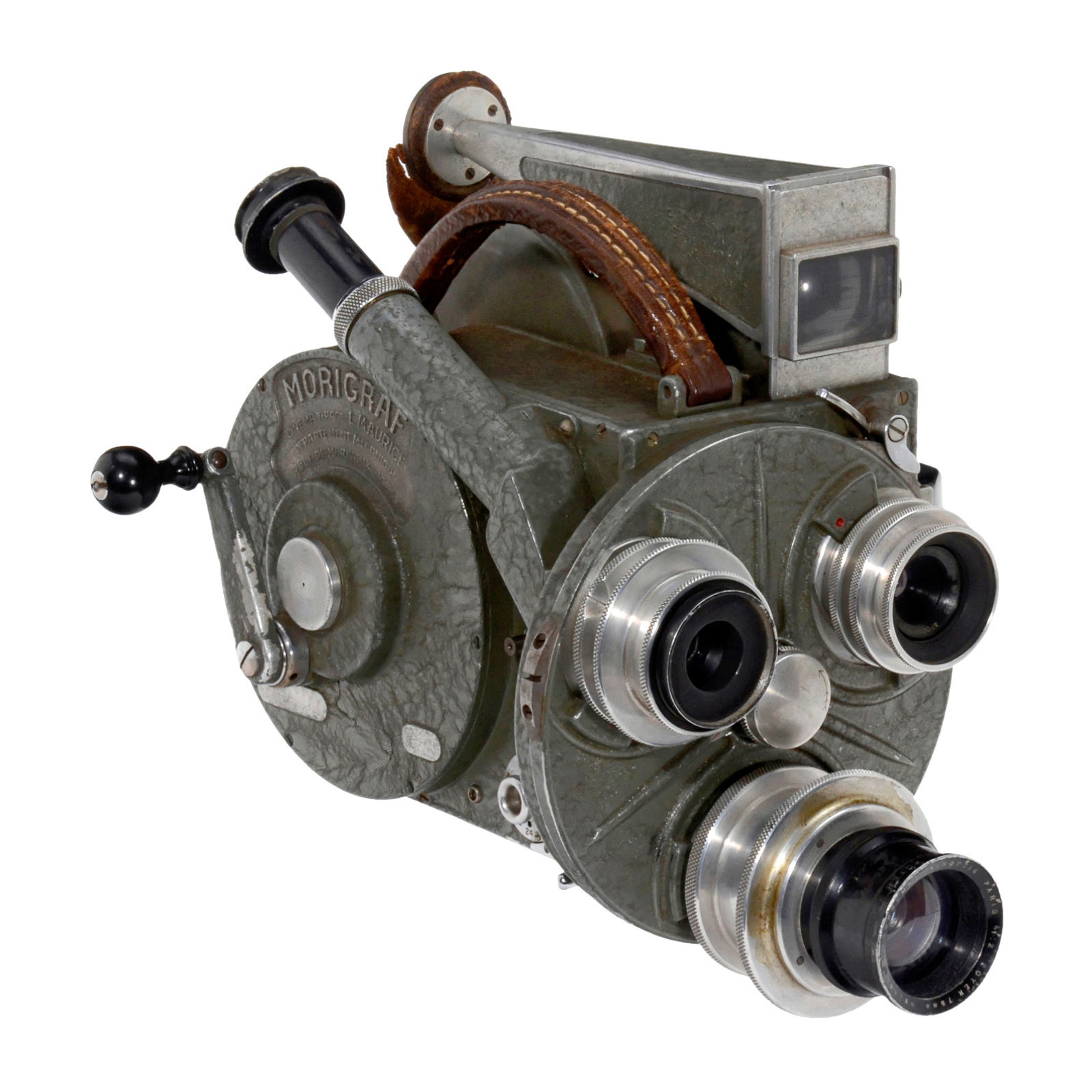 By Cinéma Tirage L. Morigraf, Paris. Type reportage, for 30 and 60 m external magazines, 3-lens turret with Kinoptik 1:2/25 mm, 1:2/50 mm and 1:2/75 mm lenses, Newton and ground glass viewfinders, clockwork motor drive (resinified). In addition: 10 magazines and French manual.
