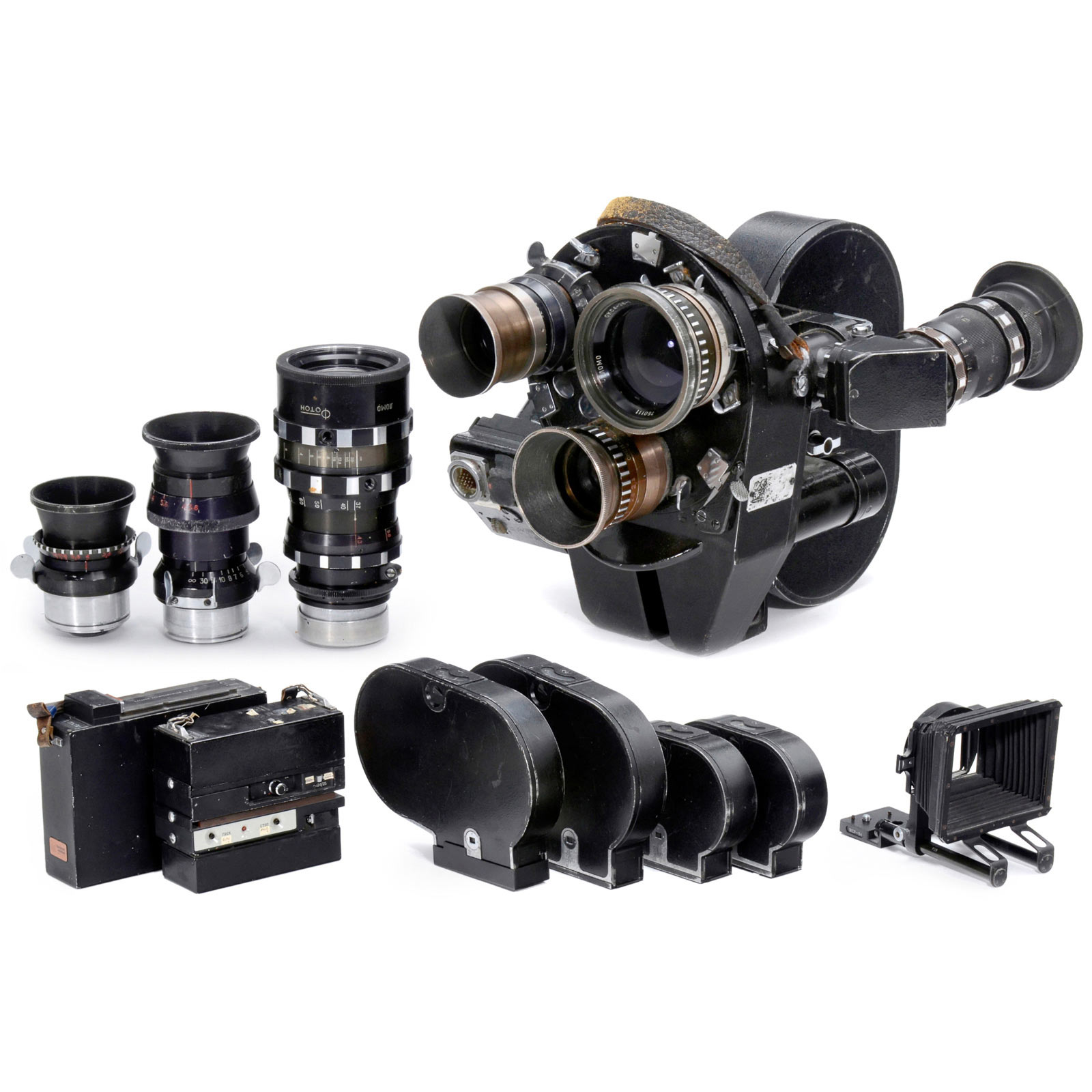 Moskauer Kinowerke. 35mm movie camera with reflex viewfinder, for 60m and 120m cassettes, three-lens turret, 6 lenses: Lomo 1:2/28 mm, 1:2,3/35 mm, 1:2/75 mm, 1:2,3/50 mm and Jupiter 1:3,5/135 mm, one zoom lens: Lomo 1:4,3/37–140 mm, 3 cassettes 60 m, 2 cassettes 120 m, compendium, original case. – Electric functions not tested.