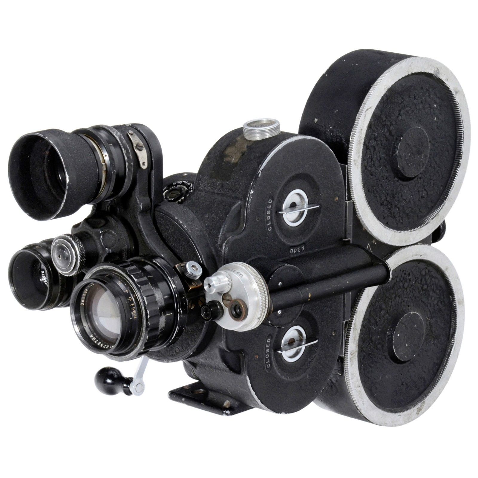 Bell & Howell, USA. 35mm reporter camera for 60m daylight cassettes. 3-lens turret: Zeiss Biotar 1:2/50 mm, Sonnar 1:2/85 mm and 1:1,5/50 mm, clockwork drive, with 2 handcranks. Popular newsreel camera in WWII and Korean War.