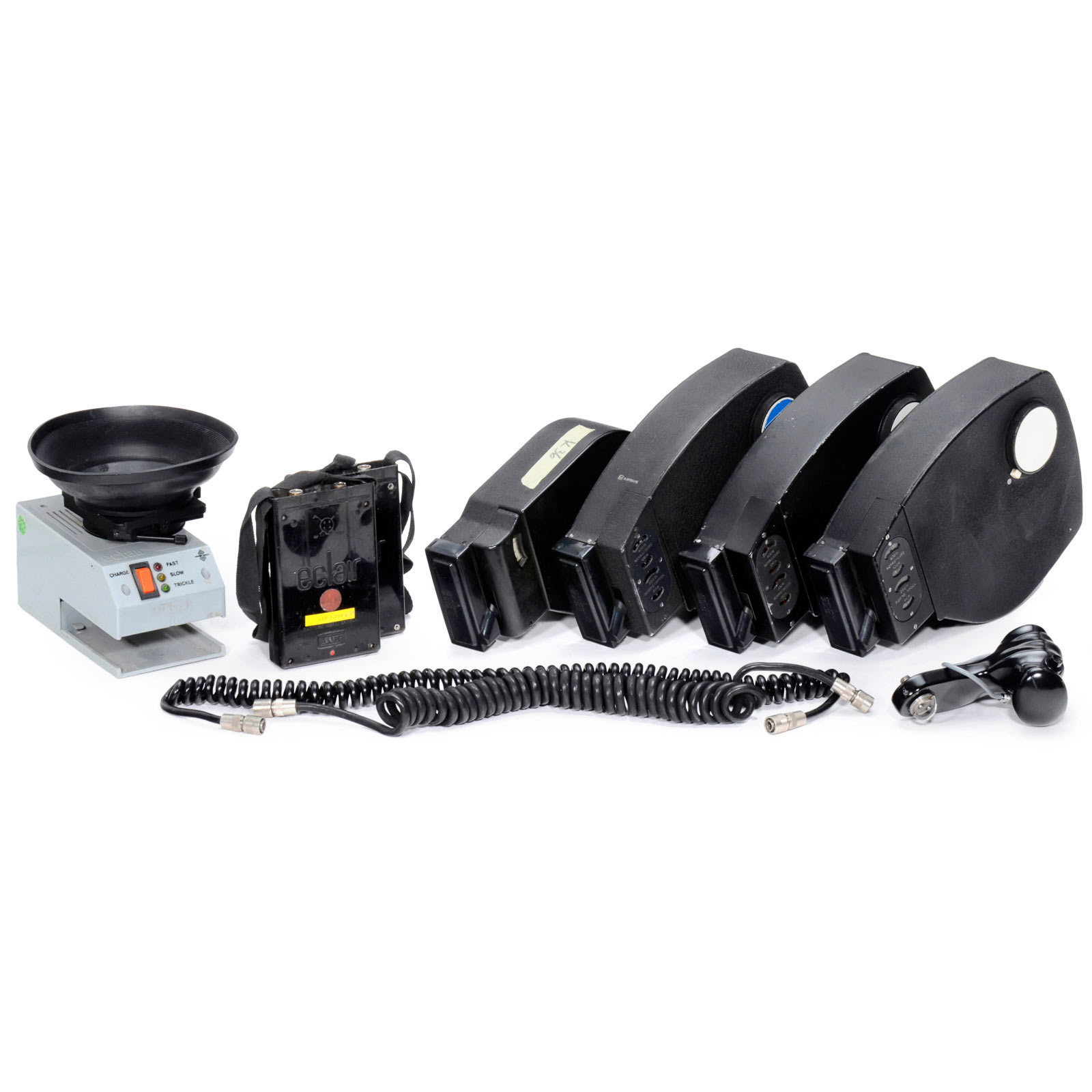 Eclair, Paris. Low-noise 16mm reflex camera for hand and tripod operations, lens: Zeiss Vario-Sonnar 1:2,8/10–100mm. – Accessories: 2 cassettes for 60 m film, 3 cassettes for 120 m film, lens hood, cables, rechargeable battery, battery charger. – Electric functions not tested.