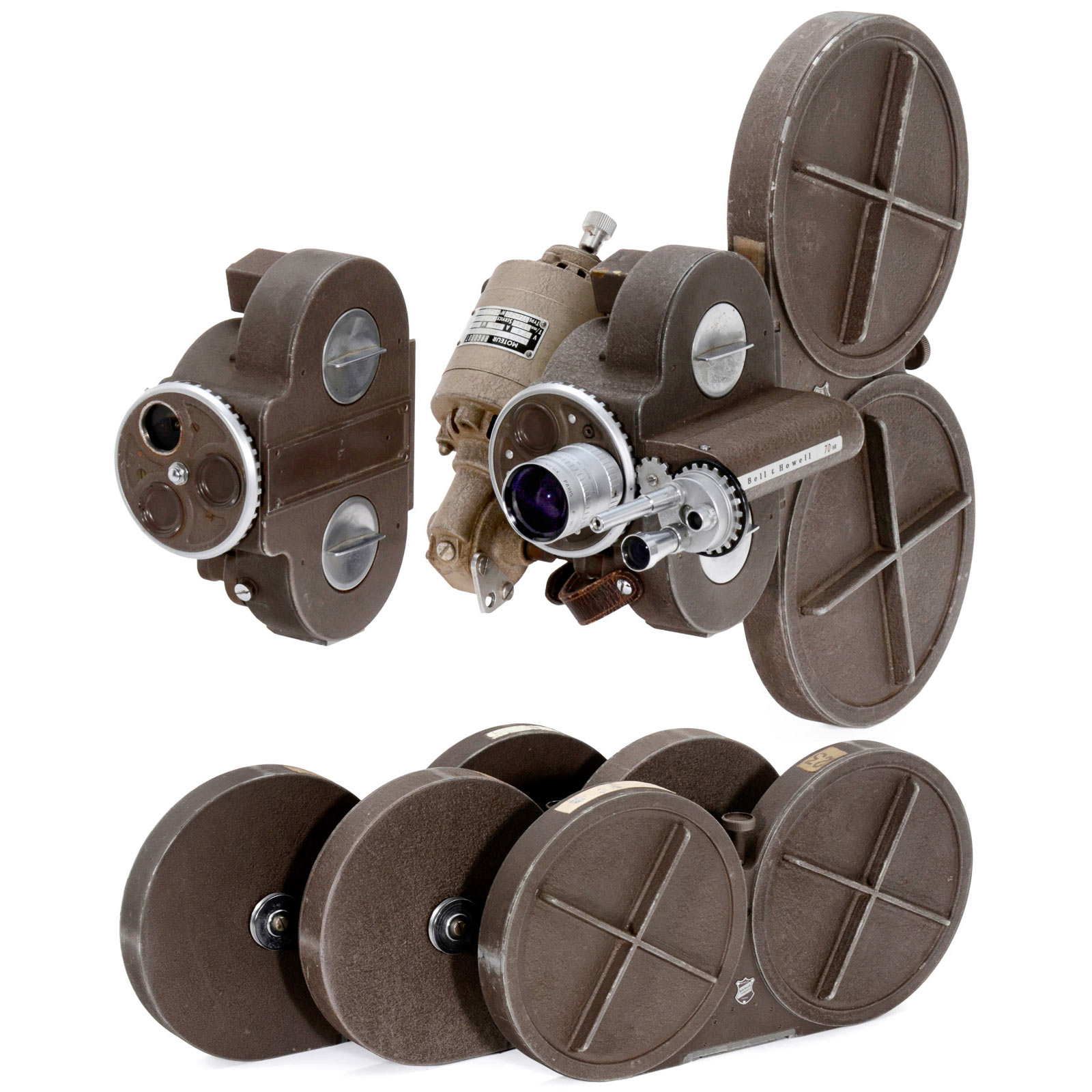 American 16 mm movie camera equipment, for 120 m spools in special magazines, including 2 camera bodies with 3-lens turret for C-mount lenses, clockwork or electric motor drive (electric function untested), Angenieux 1:1,8/10 mm C-mount lens, 3-viewfinder turret. – In addition: 4 cassettes for 120 m, crank and spare parts.