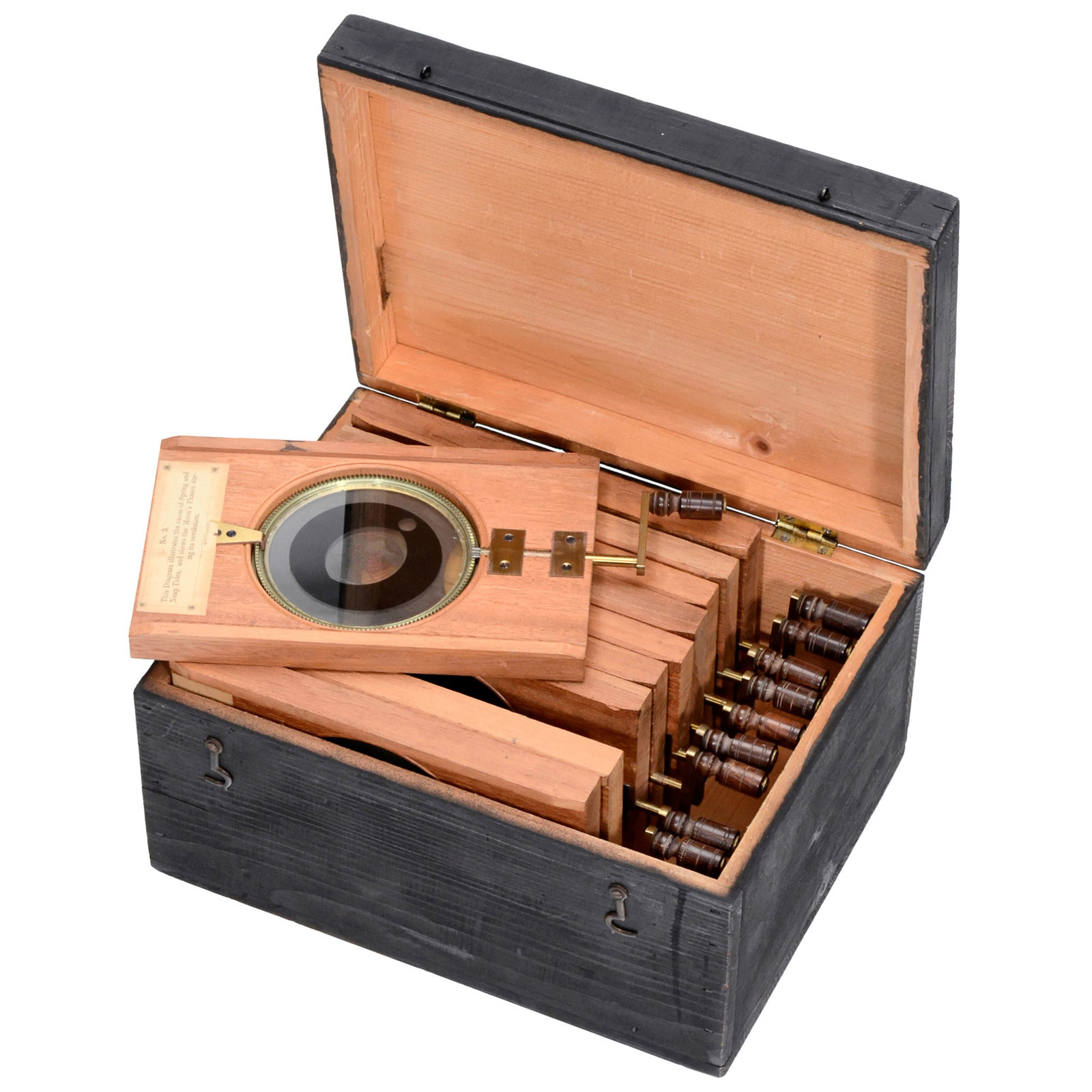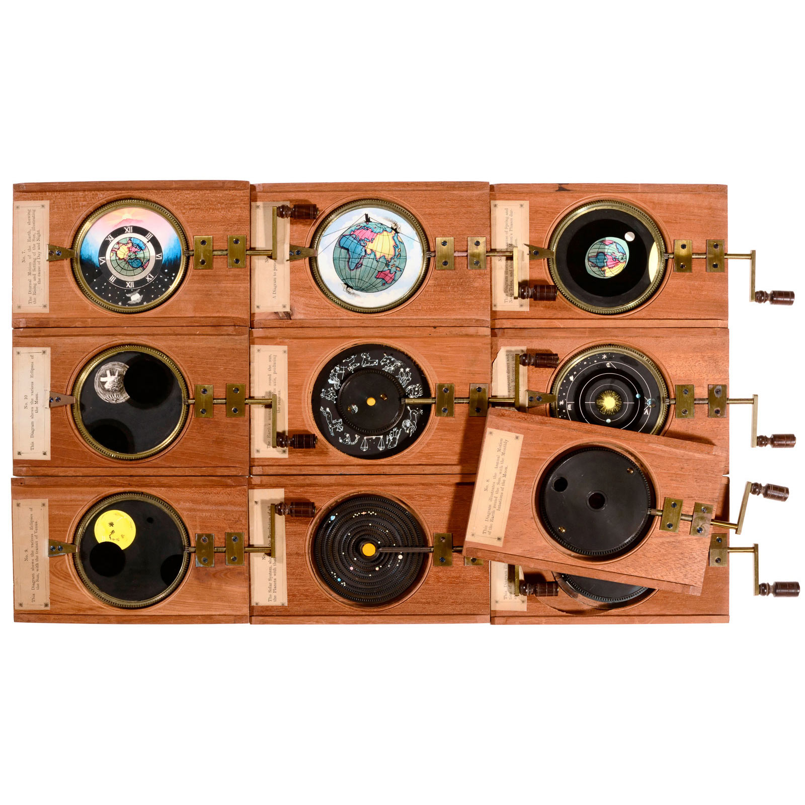 10 finely hand-painted astronomical double rackwork slides, 4 x 7 in., images Ø 3 1/5 in., all slides with English labels, 1 slide cracked, everything else like new, with wooden box.