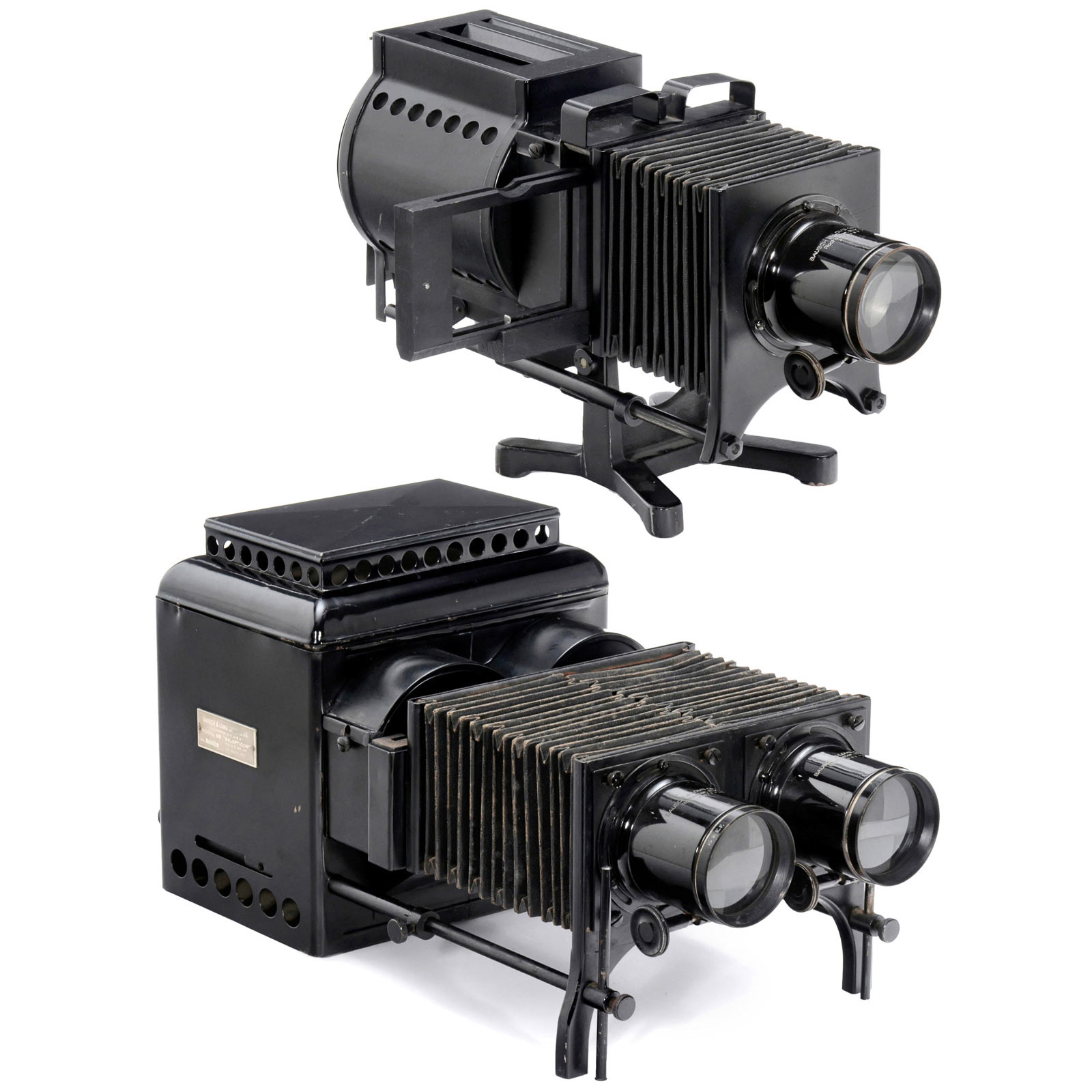 1) Bausch & Lomb Optical, USA. For slides of 8 x 8 cm, with 2 original bulbs, 2 lenses of 15 in. by Bausch & Lomb. With patent pending (copy), 110 volt. Early dissolve projector. (3+/–) – And: 2) Magic lantern by Bausch & Lomb, c. 1915, for lantern slides of 8 x 10,5 cm, 110 volt, lens by Bausch & Lomb. (3/–) – Electric functions not tested.