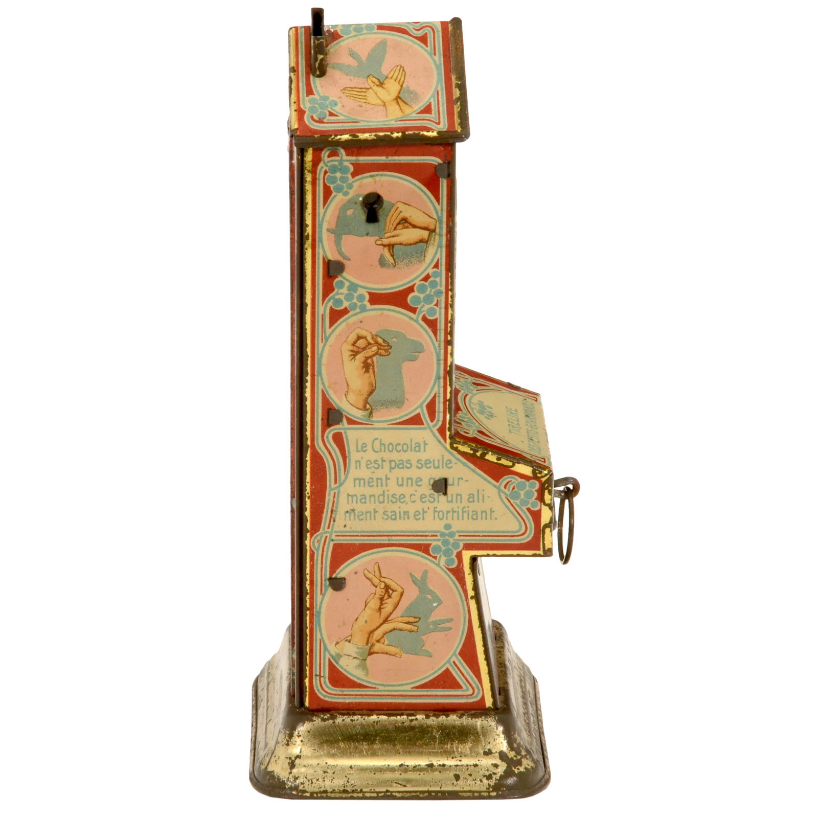 Small chocolate dispenser as tin saving box, with 2 glass plates, coin-slot on top and drawer on front. Lithographed with beautiful shadow play motifs from the age of the magic lantern, height 6 in.