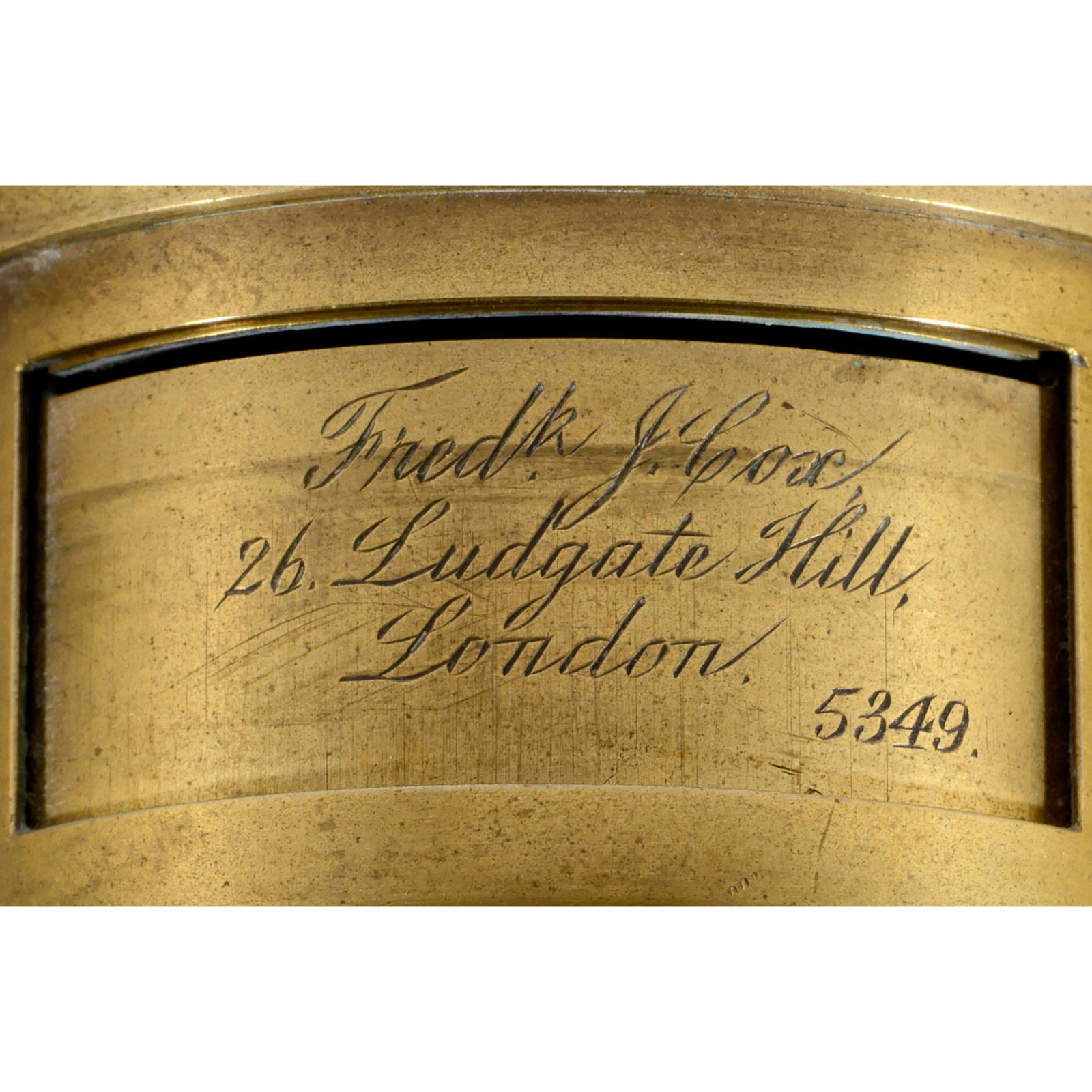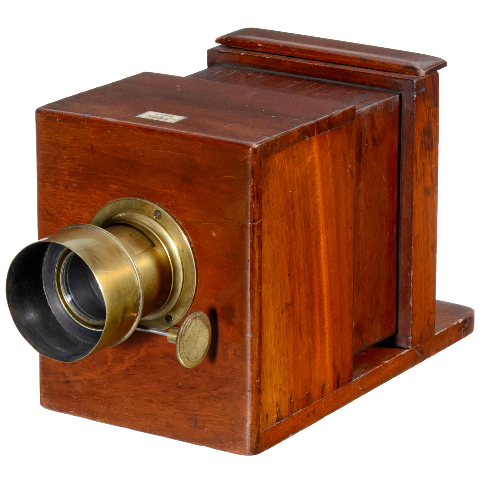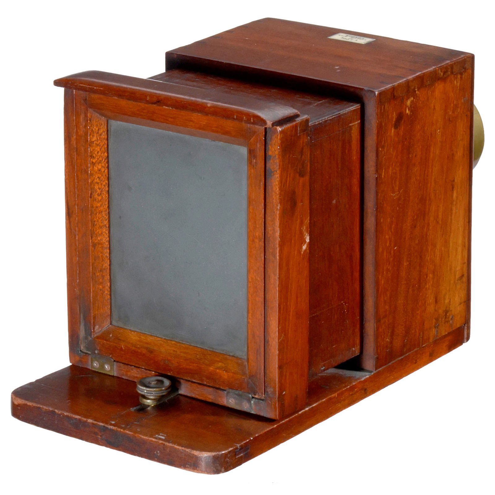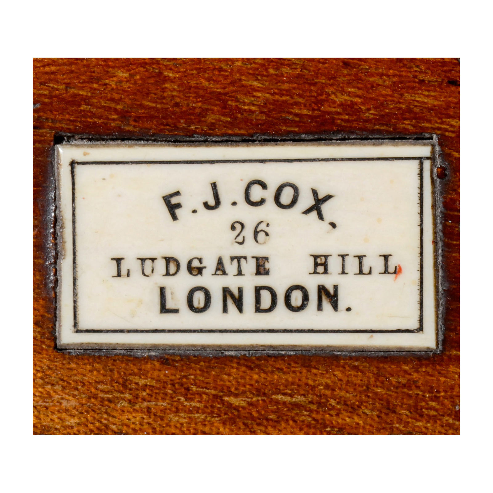 Frederick J. Cox, 26 Ludgate Hill, London. One of England's earliest camera makers. ½ plate size, with original brass lens: "Fredk J. Cox 26 Ludgate Hill London, no. 5349", for waterhouse stop and rack-and-pinion focusing, focusing screen back. – Extremely rare to find a Cox body and lens together. – Excellent original condition. – Museum quality!