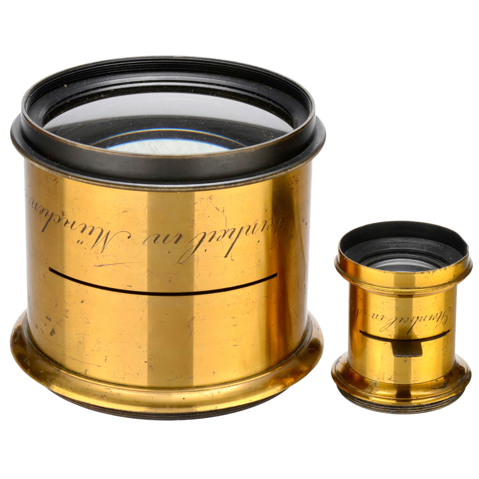 1) Presumably "Gruppen-Aplanat", focal length approx. 1,400 mm! Height of the lens 4 in., Ø 4 in., no. 8321. – Clean lens! – And: 2) Presumably "Periskop" lens, focal length approx. 240 mm, height 2 in., Ø 1 ½ in., with one waterhouse stop, engraved "No. 3251".