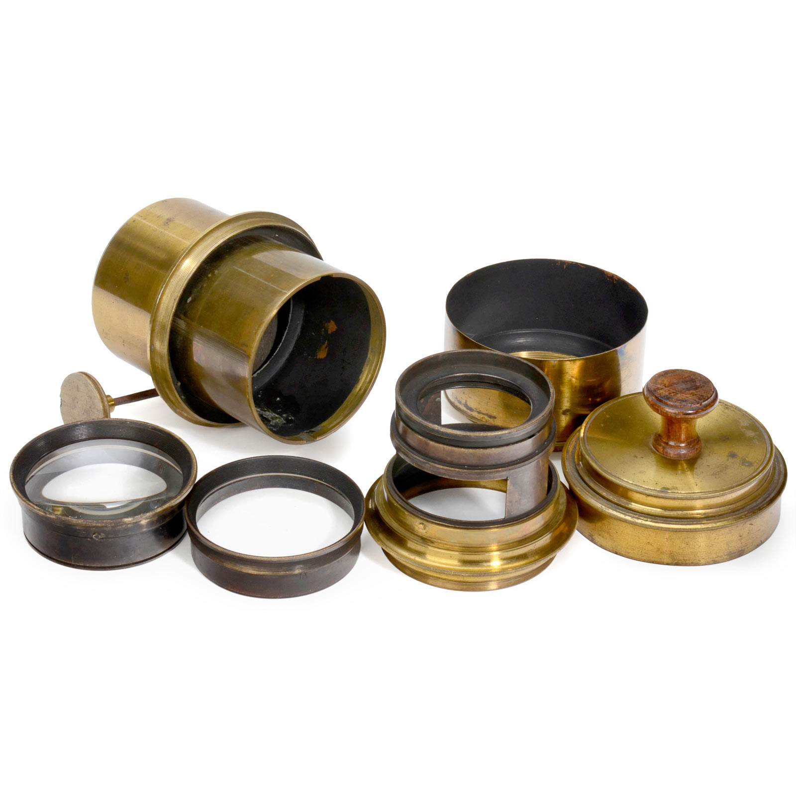 Unnumbered. This lens (patented in 1858) is basically a Petzval-type lens, supplemented with 2 further lenses: one for the extension and the other for the reduction of the focal length. Thus, by using all sorts of lens combination, 6 different possibilities arise: 3 for portraits and 3 for landscapes. Quick change by bayonet (!) instead of screw! Washer stops. Rack-and-pinion is working. Only one of the two additional lenses is available, washer stop is not original (made of cardboard). Height approx. 21 cm, front lens Ø approx. 70 mm. With attractive wood-handled lens cap. An outstanding piece!