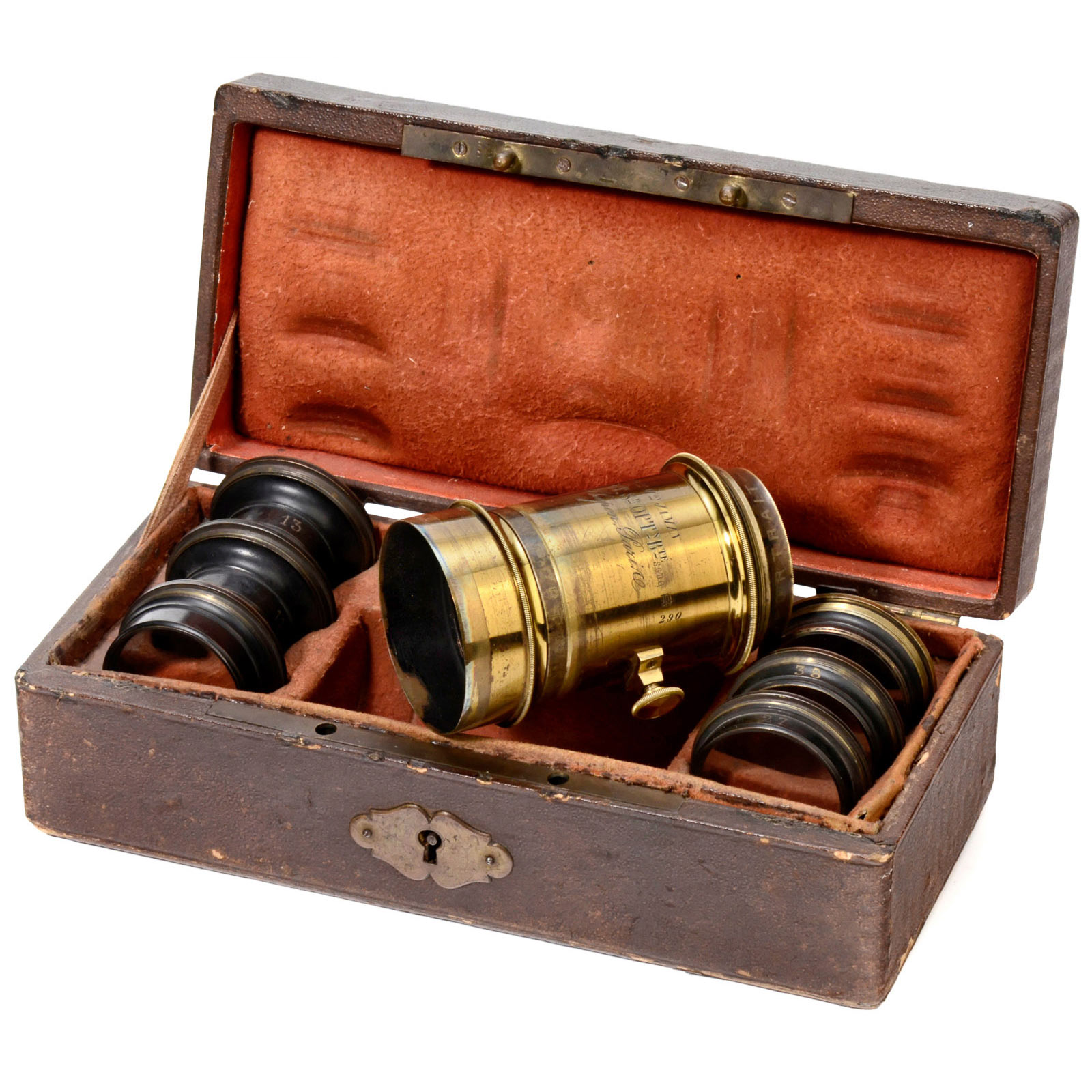 Engraving: "ANCne Mon Jamin. Darlot Sr Optn Bte 14 r. Chapon, Paris". An ordinary portrait lens was used by Darlot to develop, with the help of 6 additional achromatic lenses, a convertible lens with a 4x focusing range. Additionally, in a combination with the original lenses of the portrait lens, a further 6 different focal lengths could be obtained. Height approx. 10 cm. Complete with waterhouse stops. Lens cap and lens connecting ring, in original case. A most interesting piece.