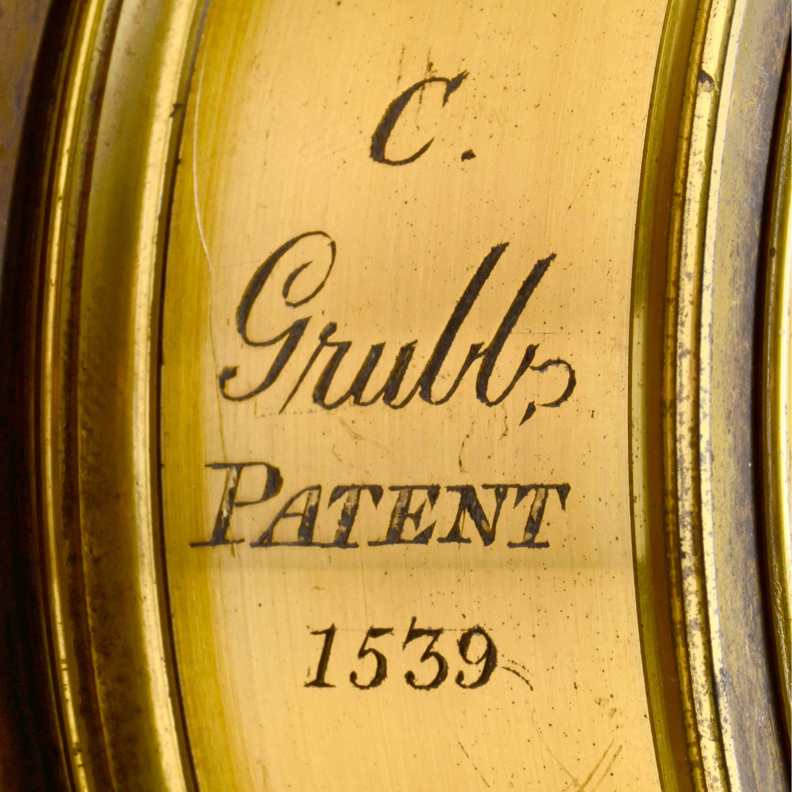 No. 1539. Th. Grubb (1801–1878) from the surroundings of Dublin, was an important, practical theorist, who did not earn the recognition that he deserved. Brass lens with collapsible front tube and attachment for washer stops. Focal length approx. 43 cm. With additional adapter ring for expanding the screw diameter from 90 to 118 mm. Very nice piece!