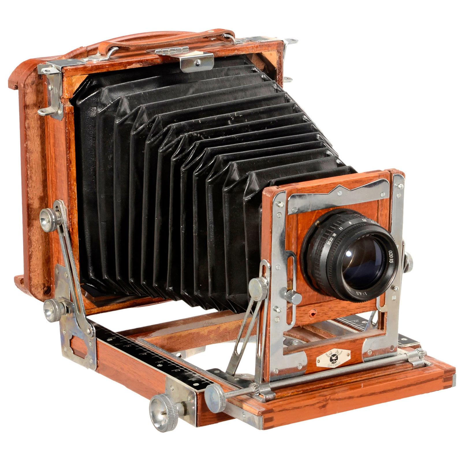 Seagull, China. Size 8 x 12 cm, double extension, dark wood with nickel fittings, black bellows, Chinese lens 4,5/180 mm, pneumatic shutter (not working), focusing screen back.