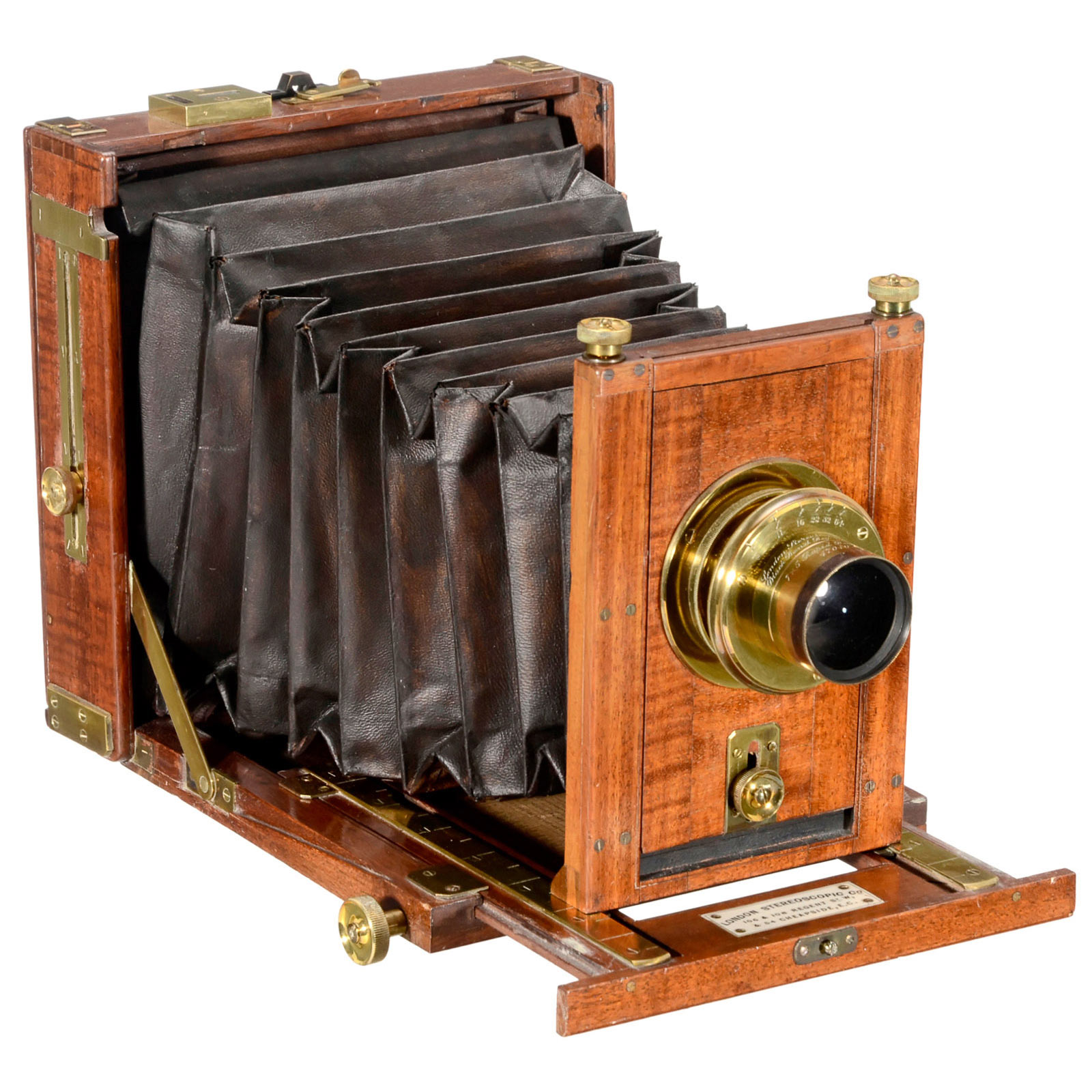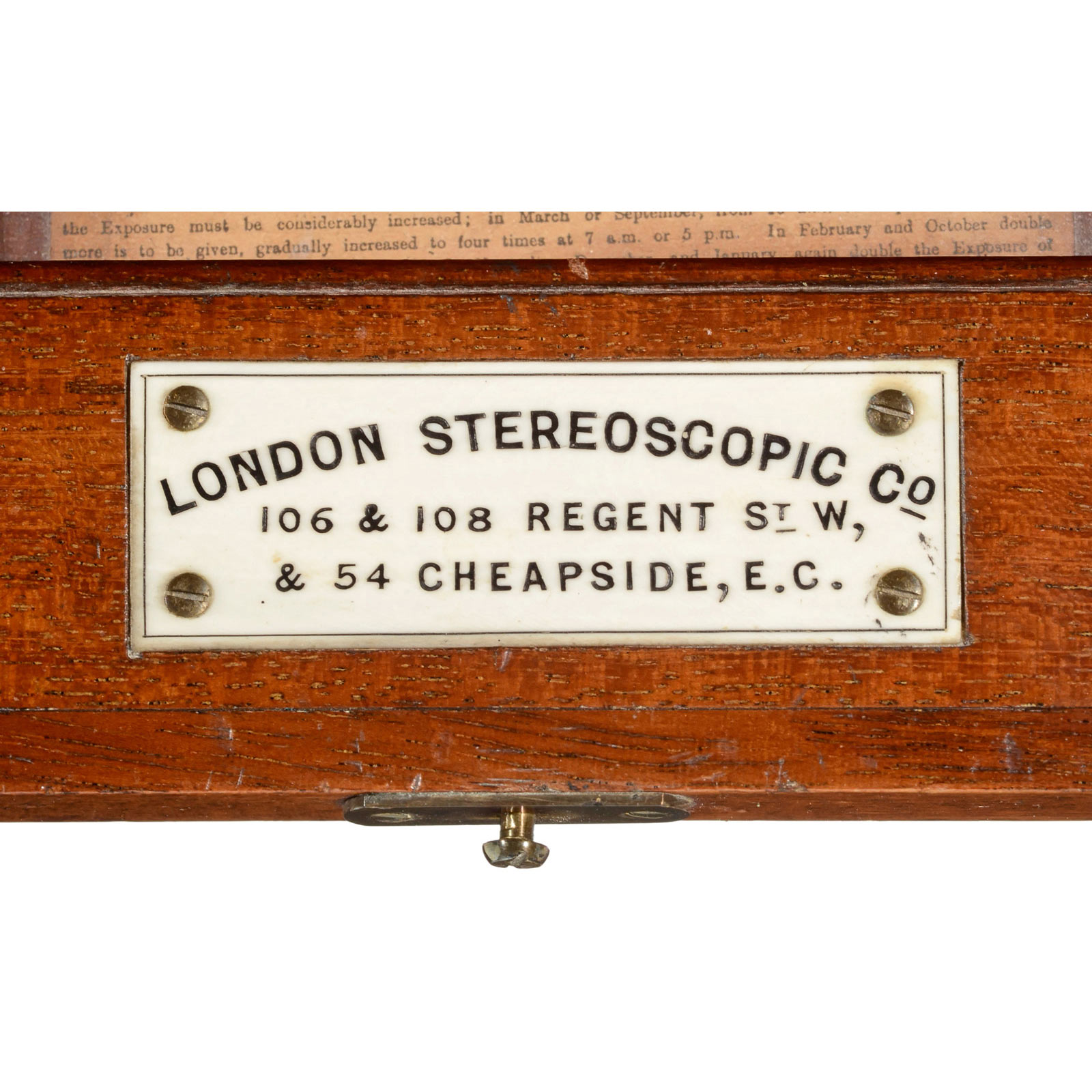 London Stereoscopic Co., 106 & 108 Regent Street W, & 54 Cheapside, E.C. Cherrywood body with brass fittings, plate size 6 ½ x 4 ¾ in., black bellows with small holes in the corners, lens: "London Stereoscopic Co's Black Band Reg. No. 88031 7 x 5 Rapid Re