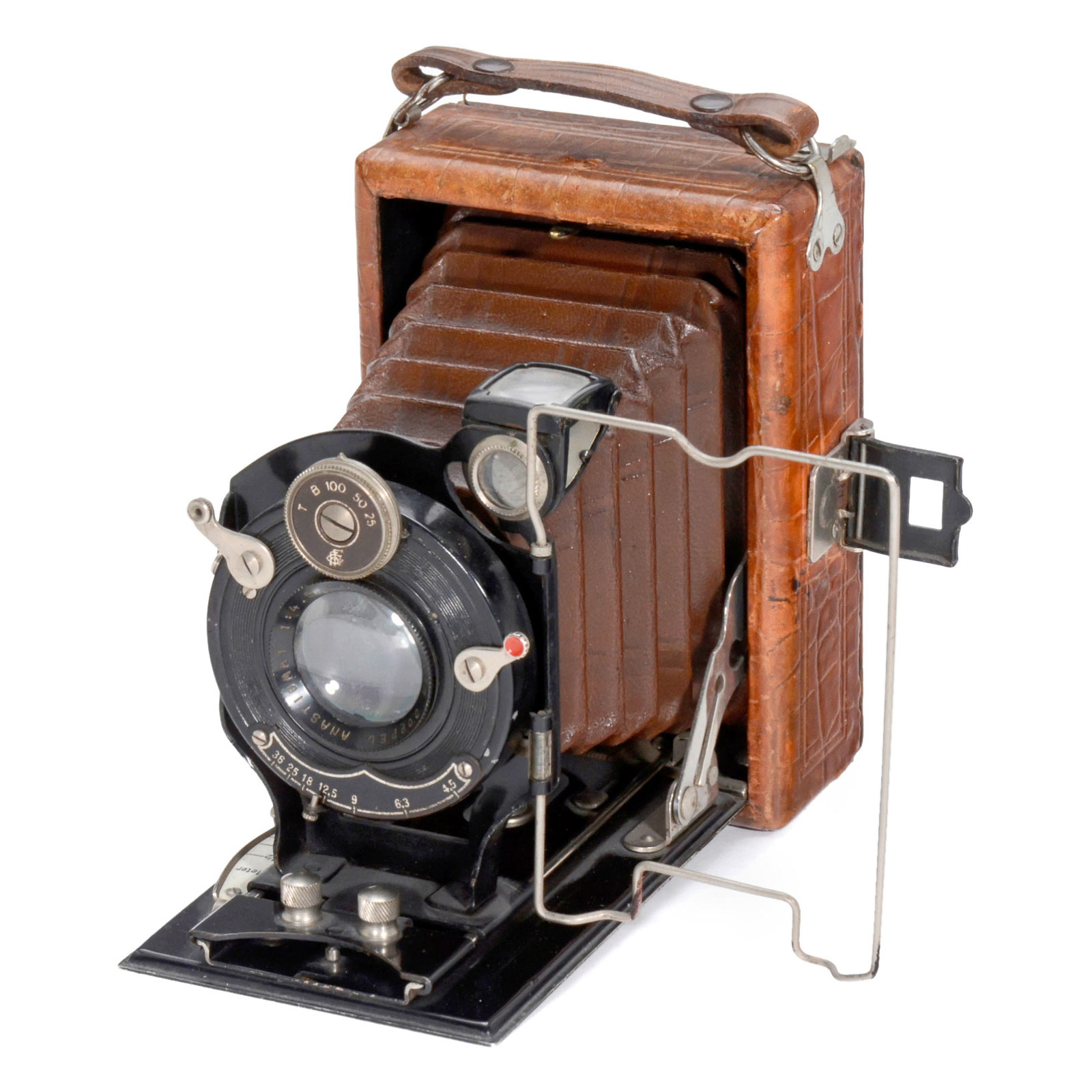 C.F. Foth, Berlin. Plate camera, size 6,5 x 9 cm, with brown alligator-skin covering and brown bellows, Foth Doppel Anastigmat 4,5/105 mm, 1/25–1/100 sec., frame finder.