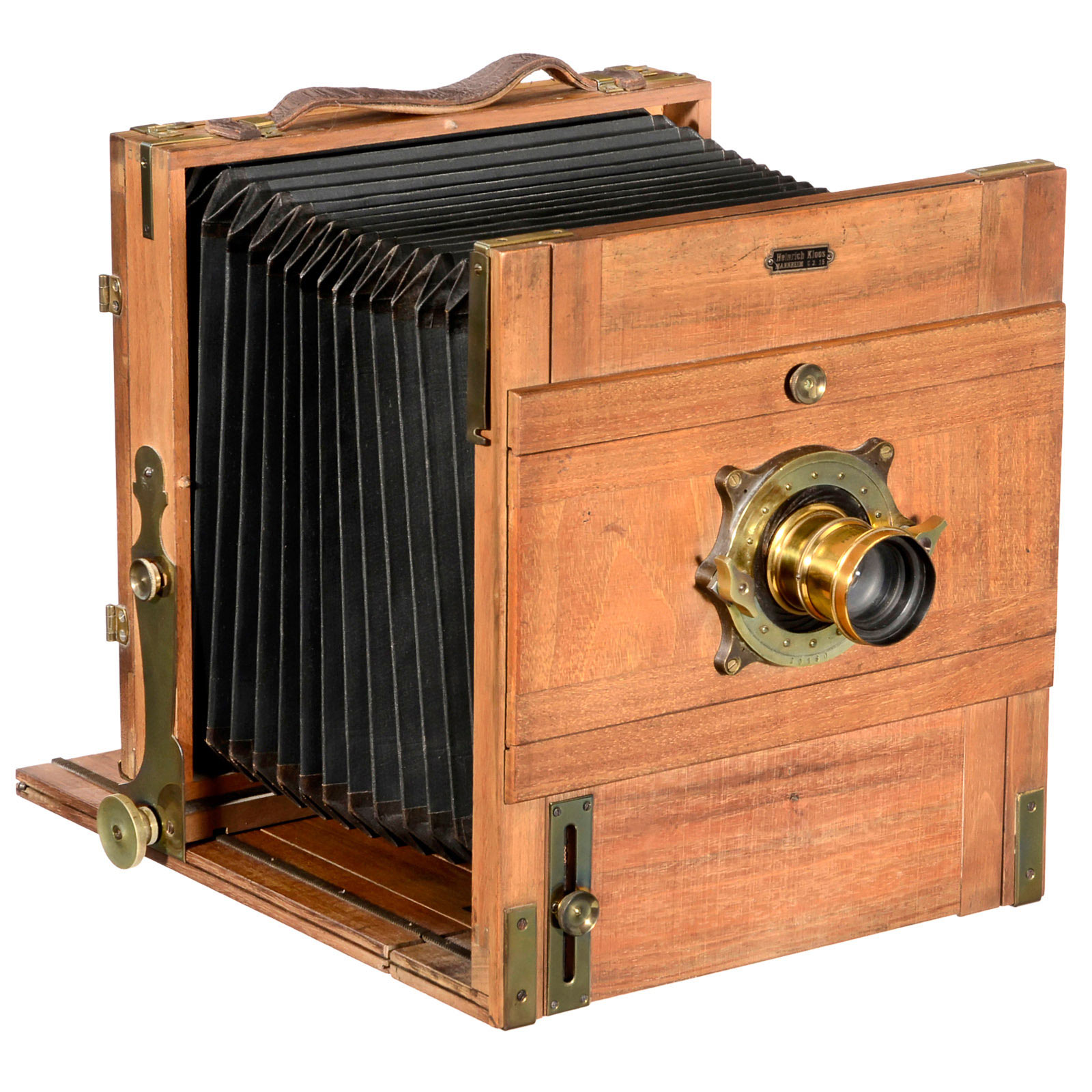 Dealer's plate: "H. Kloos Mannheim", presumably produced by Ernemann. Size 18 x 24 cm, tropical wood with brass fittings, rack-and-pinion focusing, green bellows with black corners, brass lens: "Universal Aplanat Extra Rapid Petzold & Kloos Mannheim", iris stop, universal lens holder, focusing screen back. – Excellent condition!