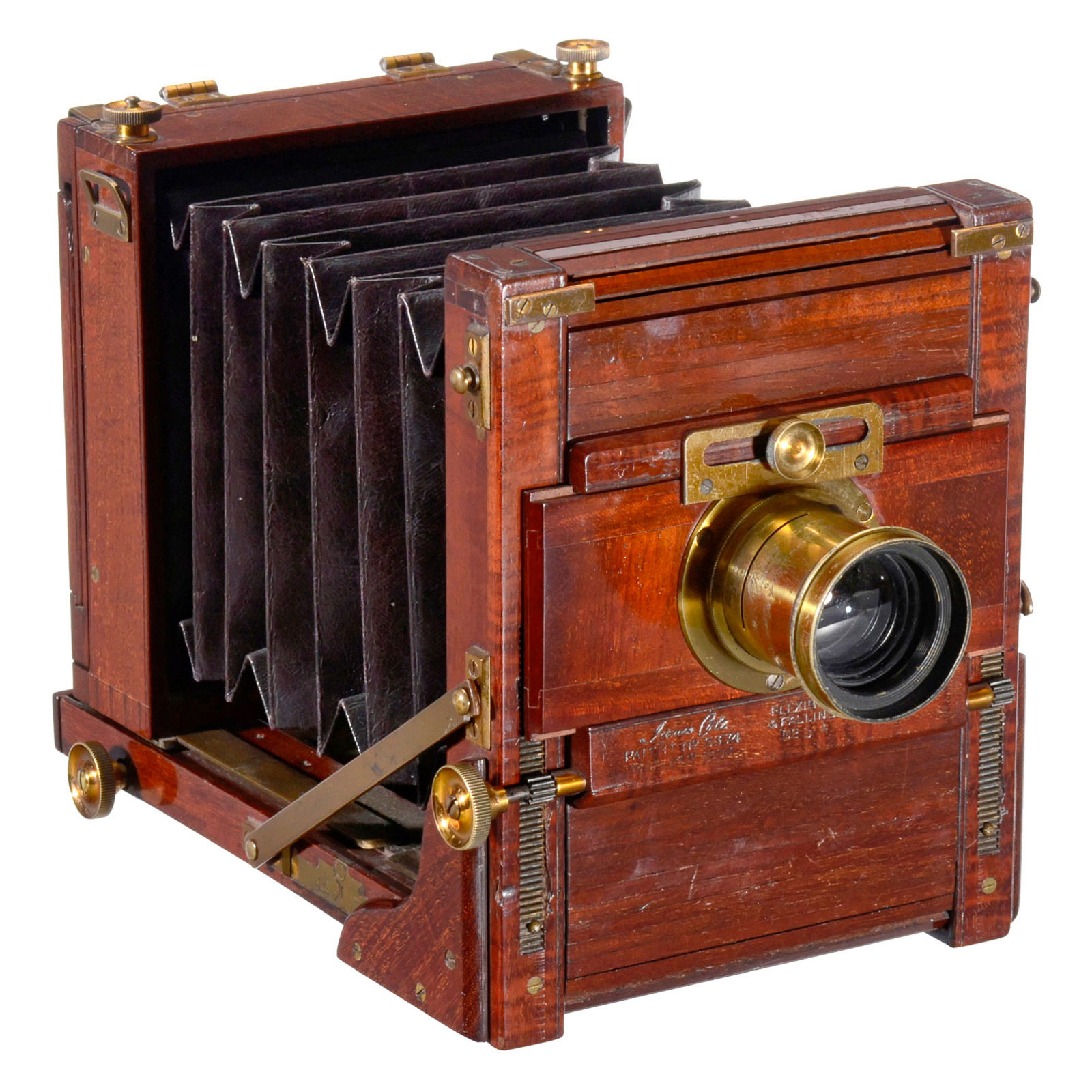 Unmarked, presumably Marion London. Plate size 8 x 10,5 cm, dark polished wood body with brass fittings, brass lens "Rapid Symmetrical" by Ross London, for waterhouse stop, dark-brown leather bellows, focusing screen back. Exceptional feature: Flexible rack-and-pinion rising and falling front (James Cole, Patent no. 5374).