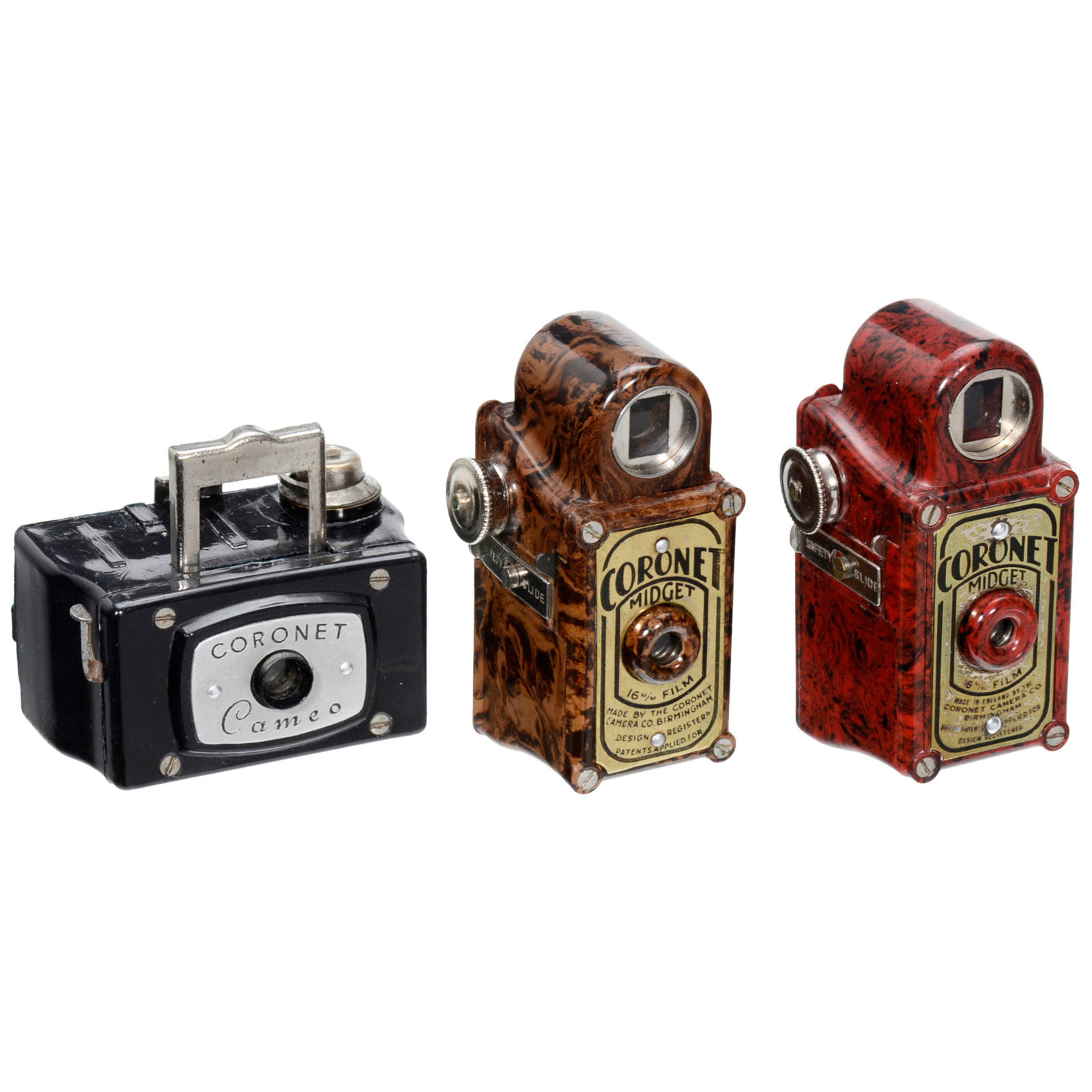 Coronet Camera Co., England. 1–2) 2 x Coronet Midget (red and brown), 1935, for 16mm film, excellent condition! (2/2) – And: 3) Coronet Cameo, 1948, size 13 x 18 mm on 16mm film, with case. (3–2/2)