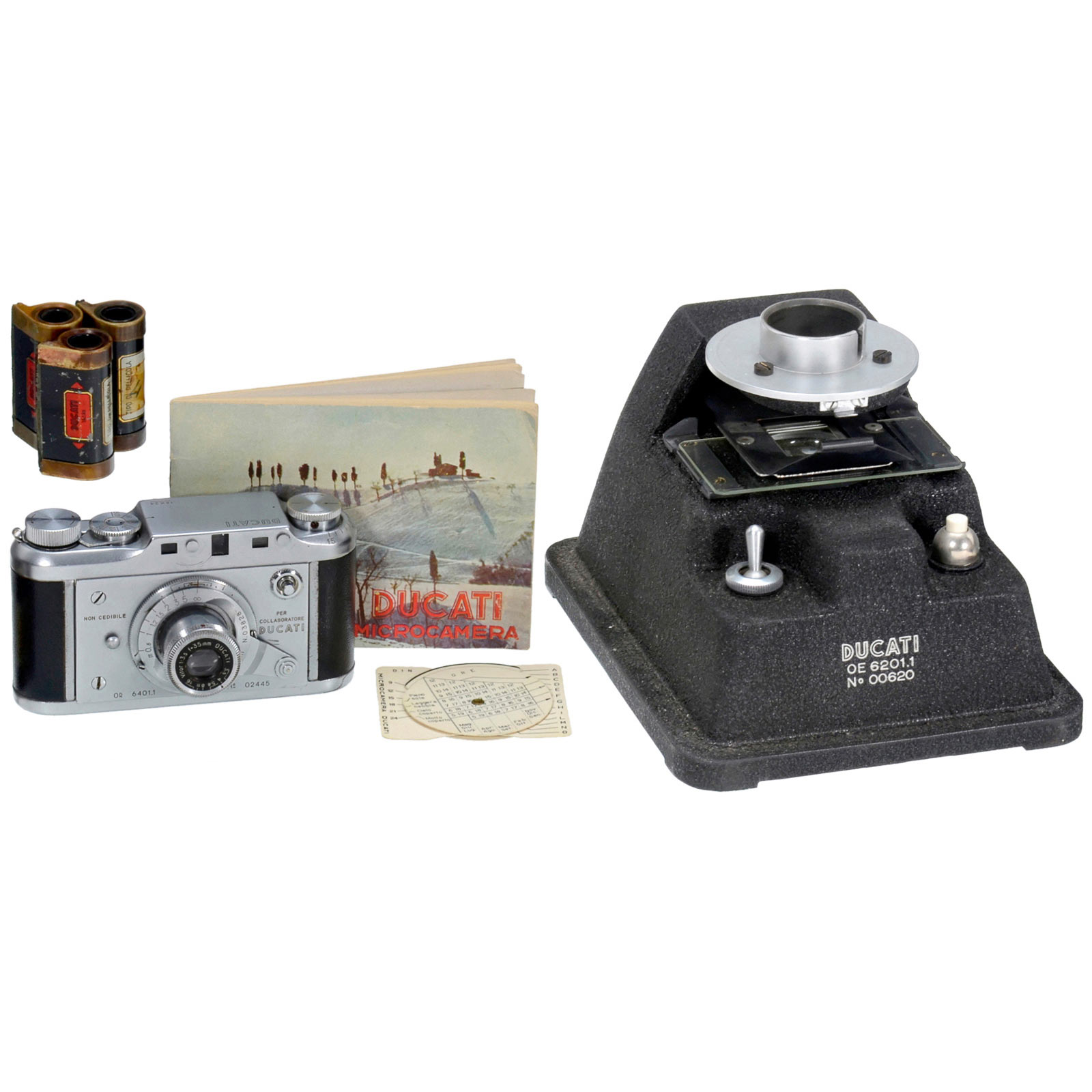 Ducati, Italy. Miniature camera for 18 x 24 mm half-format on special cassettes, body no. 02445, interchangeable Vitor 3,5/35 mm lens, focal plane shutter 1/20–1/500 sec., coupled rangefinder. With 3 film cassettes, instruction manual and copying stand.