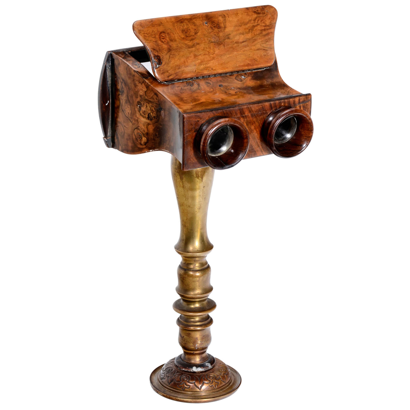London Stereoscopic Company. Stereoscope for stereo slides and stereo cards of 8,5 x 17 cm, with burr-walnut-veneered body (with some dents), fixed focus lenses, with hinged mirror lid and ground glass, on later metal stand.