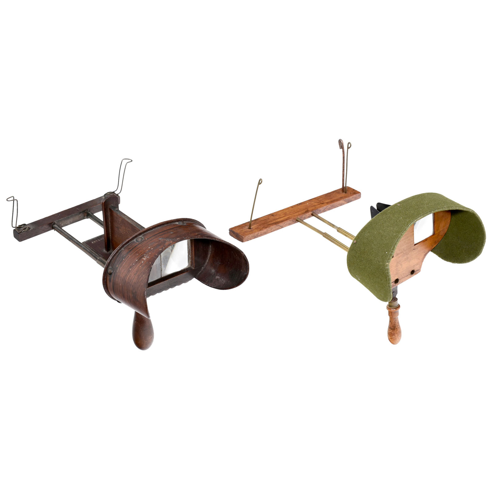 1) John Ardito or Antonio Quirolo, New York (marked on grip), c. 1872, for 9 x 18 cm stereo cards. – Literature: Paul Wing, "Stereoscopes – The First Hundred Years". – And: 2) Unmarked Holmes-pattern stereoscope for 9 x 18 cm cards, unusual focusing, one card holder missing.