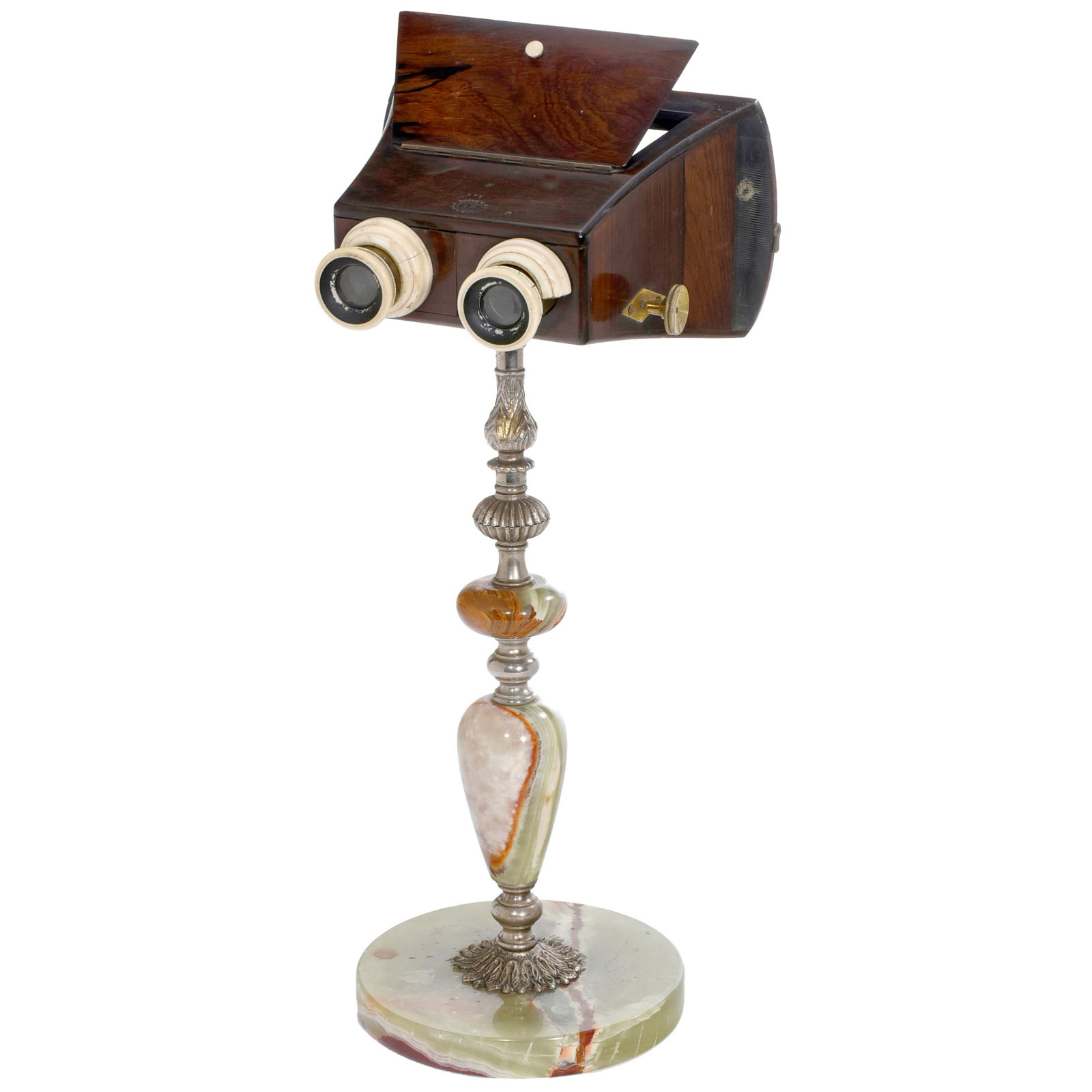French manufacturer, stereoscope for stereo slides and cards of 8,5 x 17 cm, rosewood-veneered body, rack-and-pinion focusing (inoperative), on stand of marble and die-cast elements, part of right lens-holder missing.