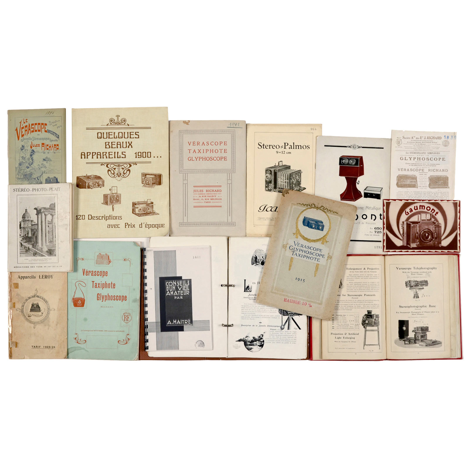 In total 13 original catalogues and 3 photocopies. Mostly Jules Richard (Homéos, Vérascope, Taxiphote, Glyphoscope), as well as Gaumont, Leroy, Ica. – And: Special catalogue Stéréo-Photo-Plait from 1918.