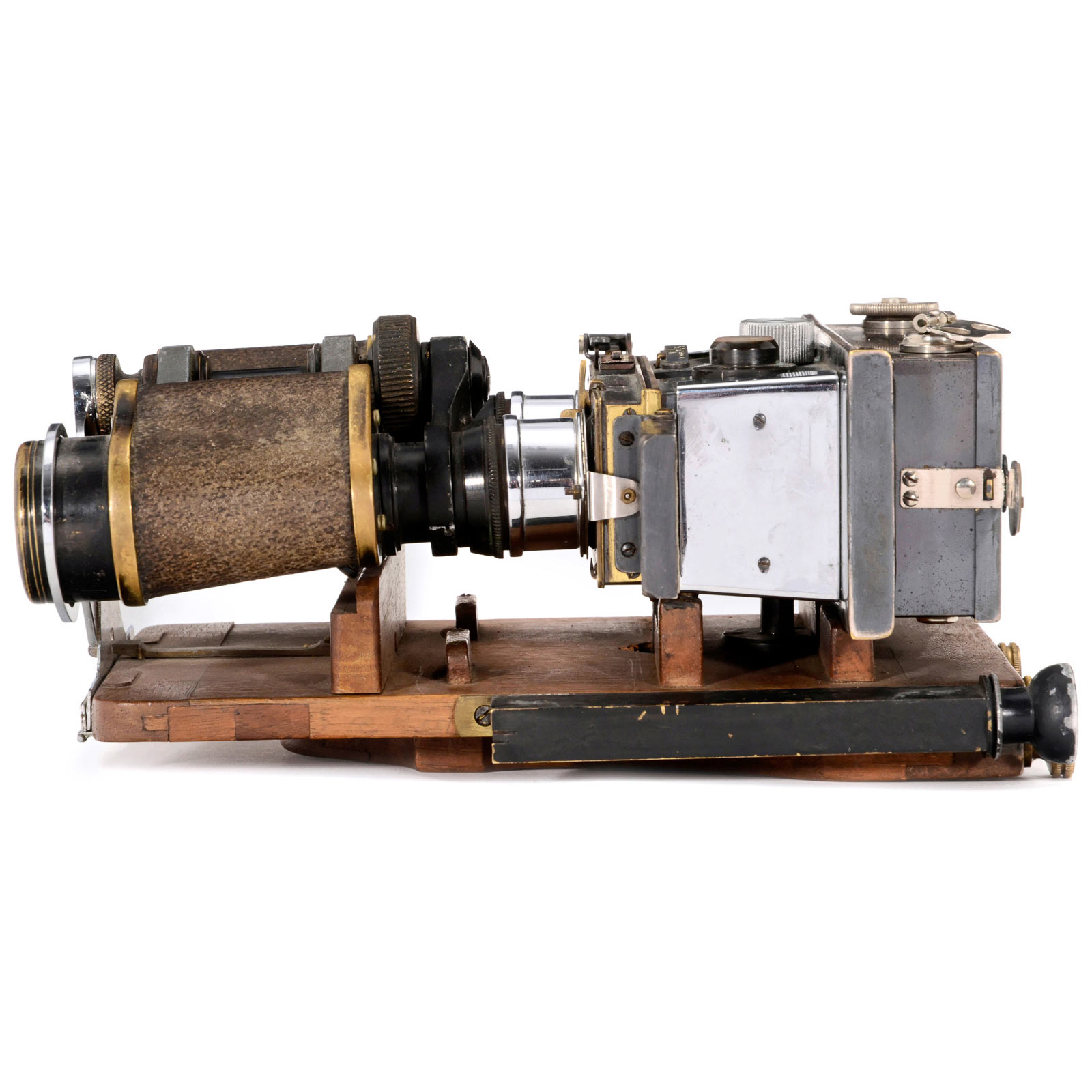Jules Richard, Paris. Combination of a Vérascope Rallongé (45 x 107) and field glasses by Jules Huet mounted together on a baseplate with 127-rollfilm back, with camera lenses: Krauss Tessar 4,5/55 mm, increase of lens separation to 12 cm, focusing via adjustment of the binocular (without control), attached Galileo viewfinder. The baseplate has 3 adjustment screws for lining up the combination vertically and horizontally. Such combinations were offered by Richard in very small numbers from 1920. – Literature: Jacques Perin, "Le Vérascope Richard", p. 109.