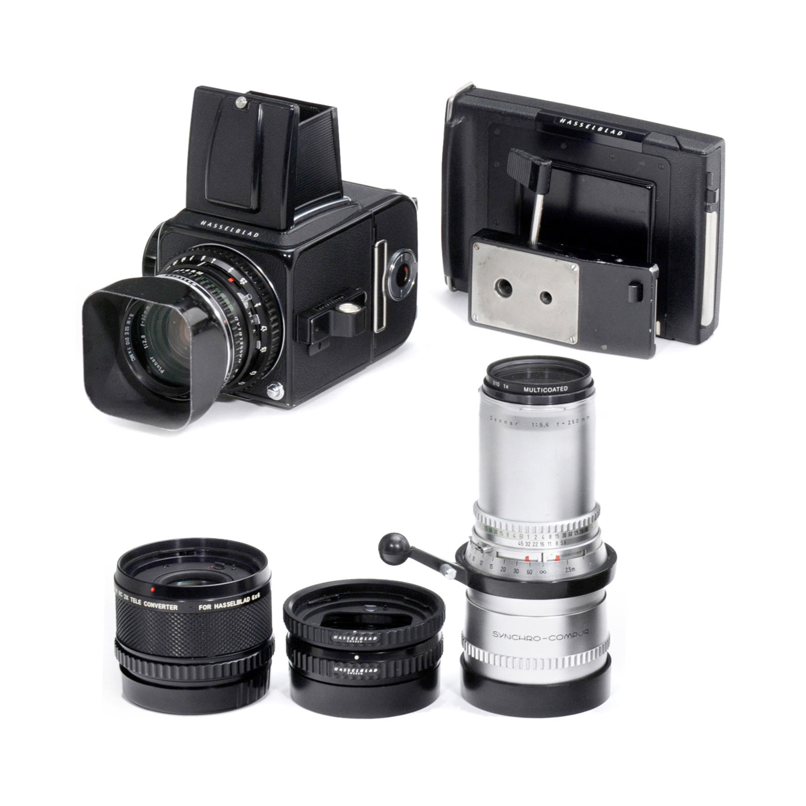 Hasselblad, Sweden. Hasselblad 500 C/M (black), no. UR 1218547, 1978, waist-level viewfinder, bubble-level, rapid-wind lever. With Planar 2,8/80 mm, lens hood and box for lens, A12-6x6 magazine. Accessories: Sonnar 5,6/250 mm, no. 5452252, chrome, rear ca