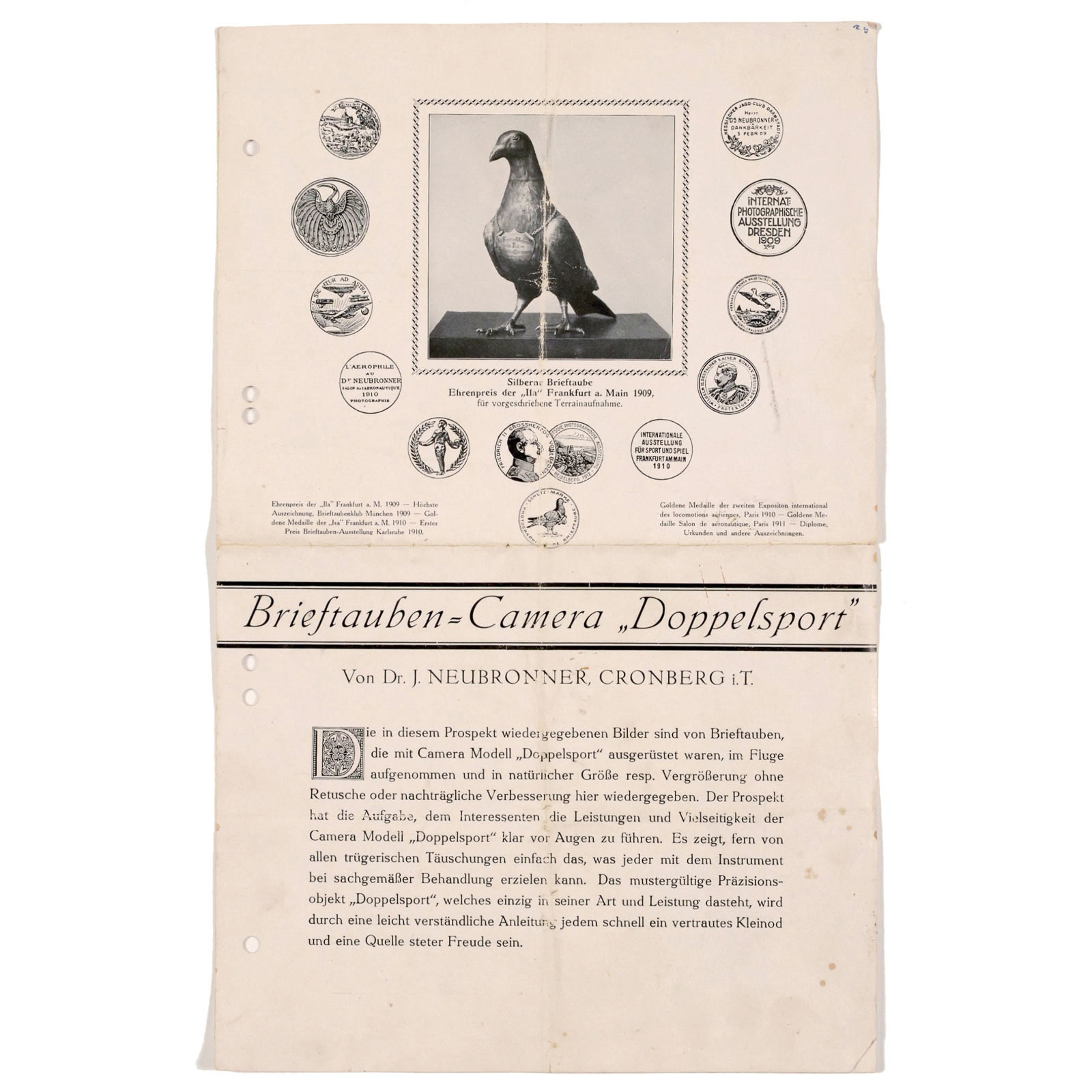 1) Original prospectus Brieftauben-Camera "Doppelsport", by Dr. J. Neubronner, Cronberg i.T., c. 1911. 4 pages with 2 illustrations of a pigeon with camera mounted in 2 different planes, plus many aerial photographs. Extremely rare. – And: 2) Dr. Julius Neubronner, "55 Jahre Liebhaberphotograph", 1920, 32 pages. A biography with detailed description of the development of the carrier pigeon camera.
