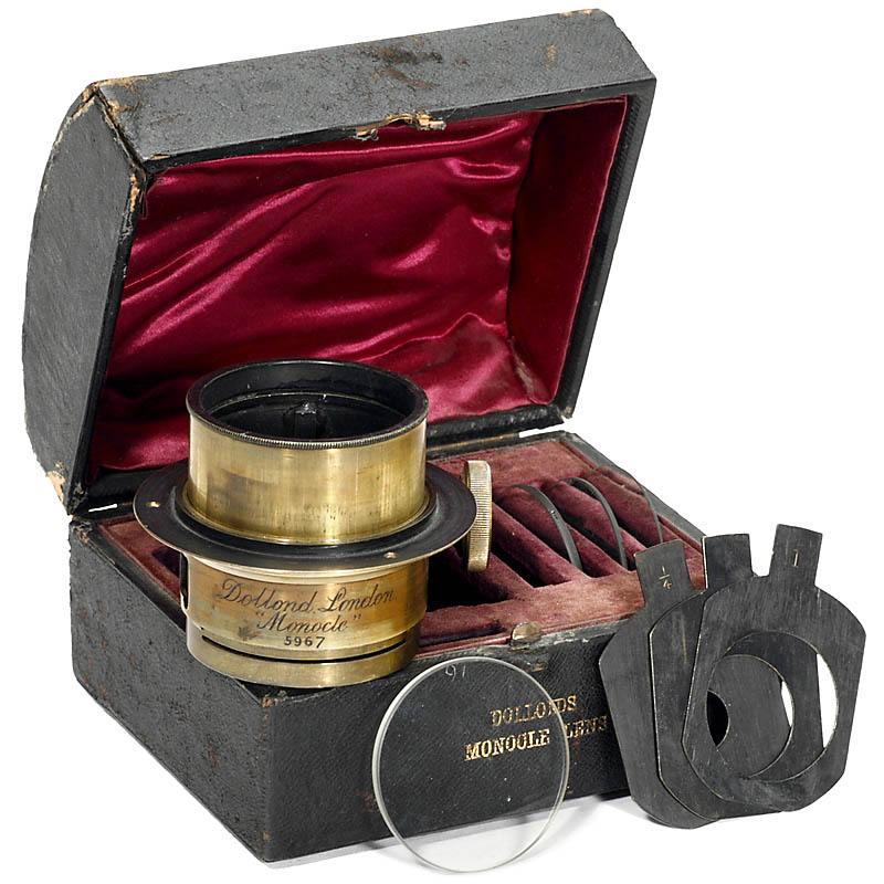 Dollond&Co.,Ludgate Hill,伦敦,少见的有4块玻璃的镜头,有雕刻,10,12,16,20。镜管序列号为No5967,有3个插入式光圈,原装皮革箱,人像镜头和拍摄风景用镜头。