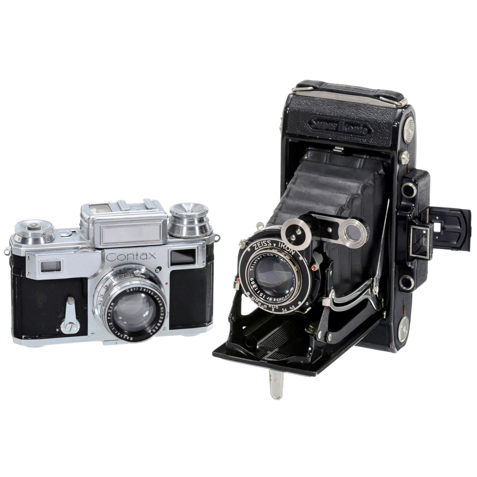 Zeiss Ikon. 1) Super Ikonta 530/15, 1934, no. Y5268, 6,5 x 11 cm, with rare Carl Zeiss "Triotar 4,5/12 cm", no. 1511389, Klio shutter. (2–3/2-) – And: 2) Contax III, 1936, no. J68857, light meter not working, with Sonnar 2/5 cm, no. 2398287. (3/3)