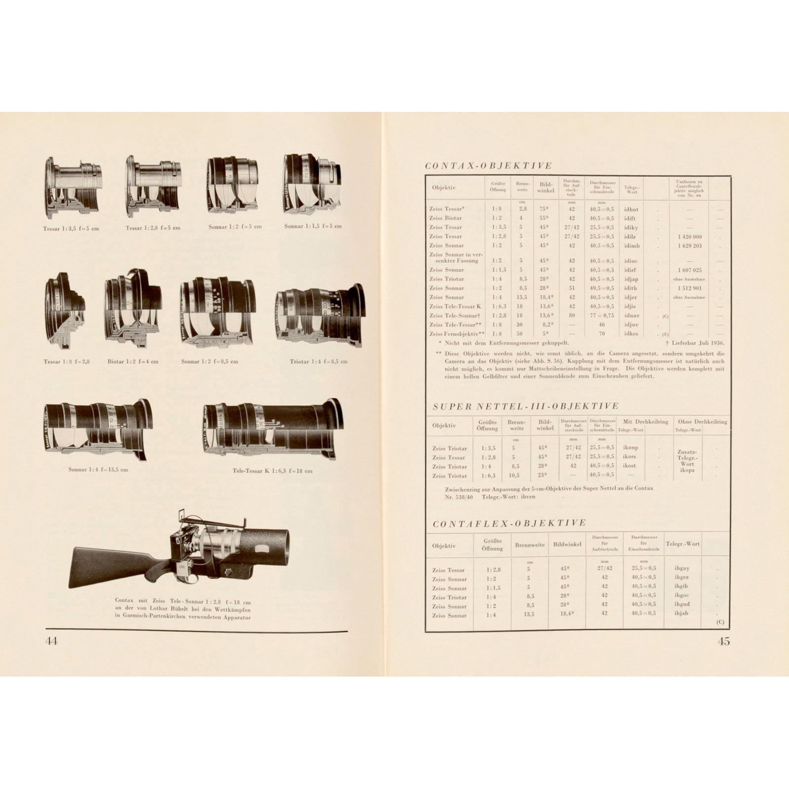 Large format, approx. 180 pages, with three price lists: 1934, 1936 and 1937. With drawings of tripod cameras "Kosmopolit", "Elegant", "Rauppcamera" and Contax I–III with all lenses and accessories and much more.