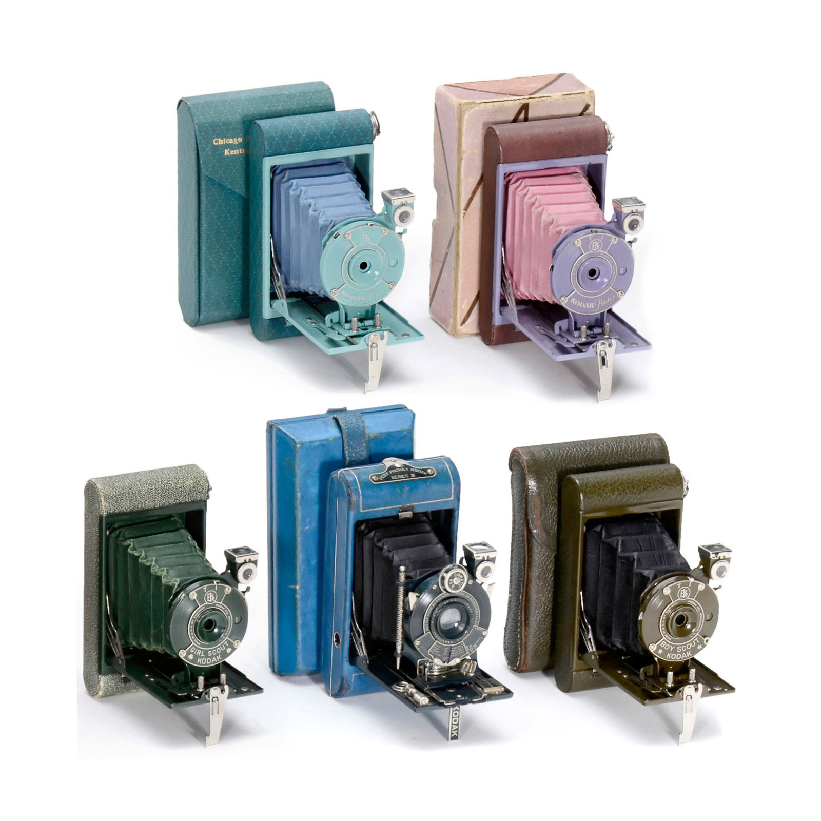 Eastman Kodak, USA. 1) Vest Pocket Kodak Series III (Vanity), c. 1928, blue leather covering, Autographic feature (with pin), blue case. (2-/2) – 2) Kodak Petite (green), 1929, with original case, stamped: "Chicago Athletic Association Kentucky Derby Party 1930". (2-/2) – 3) Kodak Petite (purple), 1929, with original box. (2-/2) – 4) Kodak Girl Scout, green, 1929. (3+/2) – And: 5) Kodak Boy Scout, olive green, 1929, with original case. (2-/2)