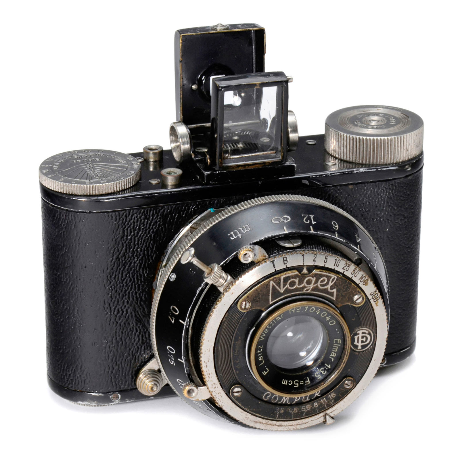 Nagel, Stuttgart. Size 3 x 4 cm, with Elmar 3,5/5 cm, no. 104040, in Compur.