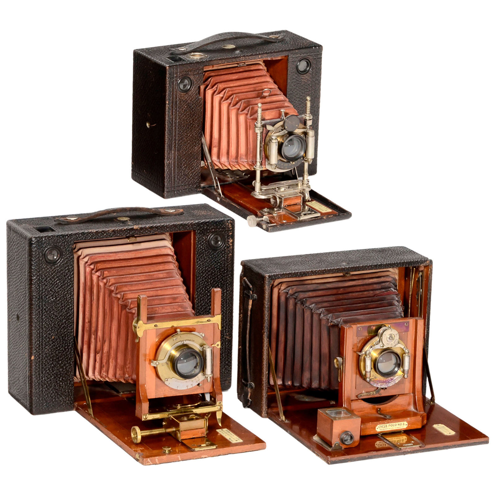 1) Eastman Kodak, USA. No. 5 Cartridge Kodak Camera, 1898, for rollfilm type 115 (7 x 5 in.), Rapid Rectilinear, Kodak shutter, dark-red bellows. (2–3/3+) – And: 2) Eastman Kodak, USA. No. 4 Cartridge Kodak Camera, 1897, for rollfilm type 104 (4 x 5 in.), Rapid Rectilinear, Kodak "Automatic" shutter, dark-red bellows. (2–3/3+). – In addition: Rochester Optical & Camera Co., Cycle Poco No. 3, c. 1900, lens by Bausch & Lomb, Unicum shutter, for plates of approx. 5 x 7 in. (3/5)
