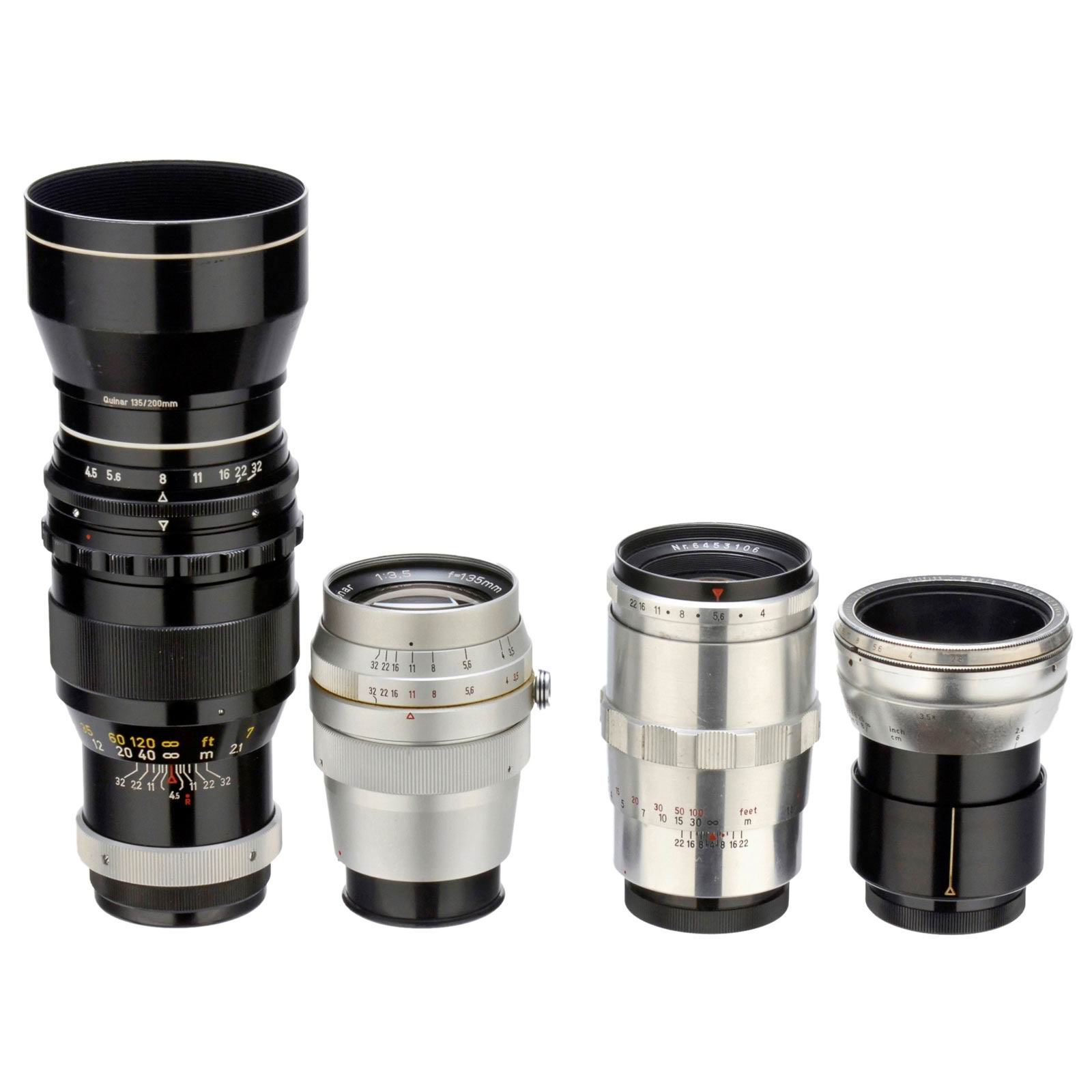 1) Kamerabau-Anstalt-Vaduz. Kilfitt-Makro-Kilar D 2,8/4 cm C, no. 245-2631, rear cap. (2–3/2) – 2) Zeiss, Jena. S 4/135 mm (Sonnar), chrome, 2 caps. (2-/2-) – 3) Rodenstock. Rodenstock-Yronar 3,5/135 mm, rear cap. (2-/2) – And: 4) Steinheil. Tele-Quinar 4,5/200 mm, black, with lens hood and 2 caps, like new. (2–1/1-)