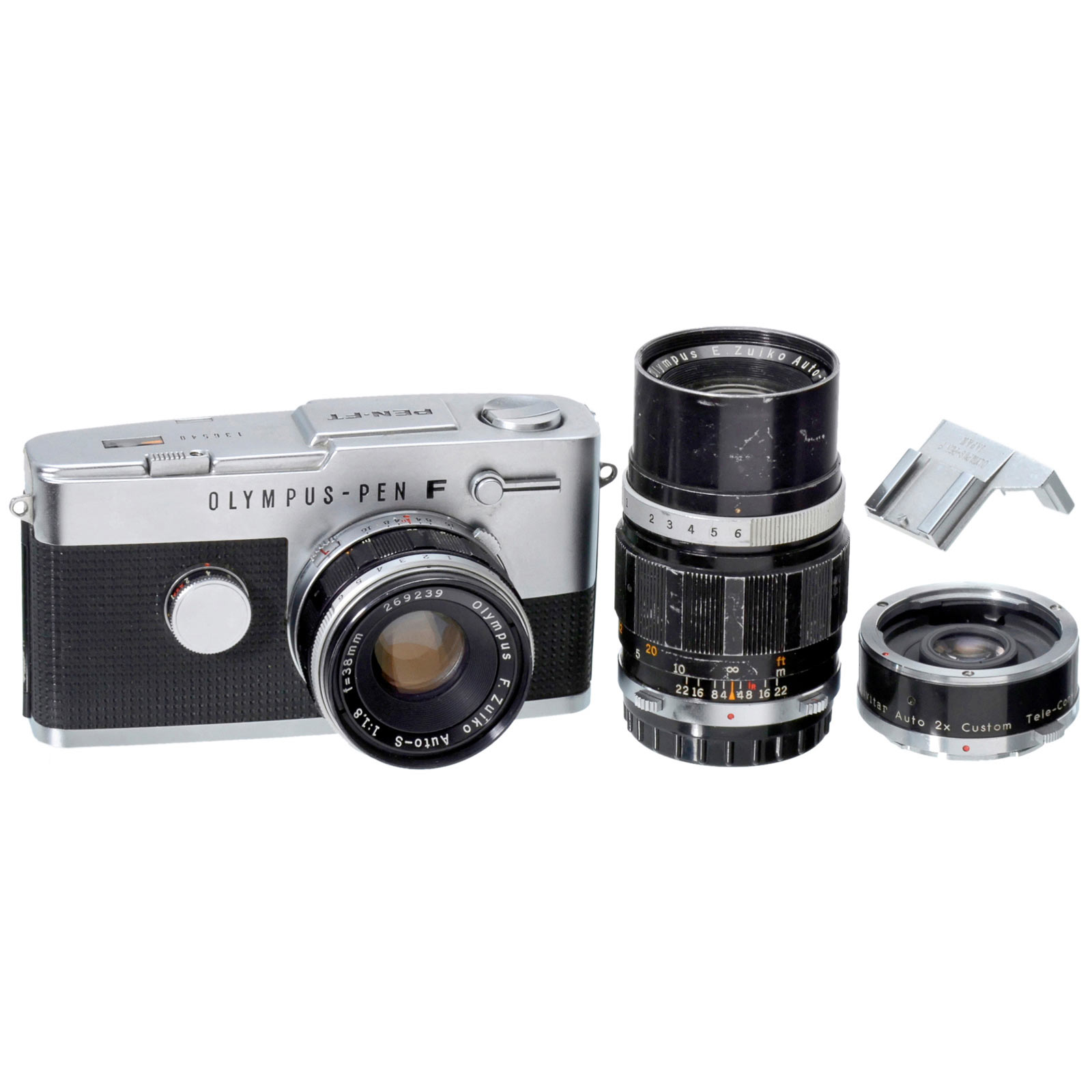 Olympus, Japan. 1) Pen-FT, chrome, F. Zuiko Auto-S 1,8/38 mm, finder eyepiece broken. (3/3-) – 2) E. Zuiko Auto-T 3,5/100 mm, 2 caps. (3-/2-) – In addition: Vivitar Auto 2x Tele-Converter and Olympus accessory shoe. (3/3)