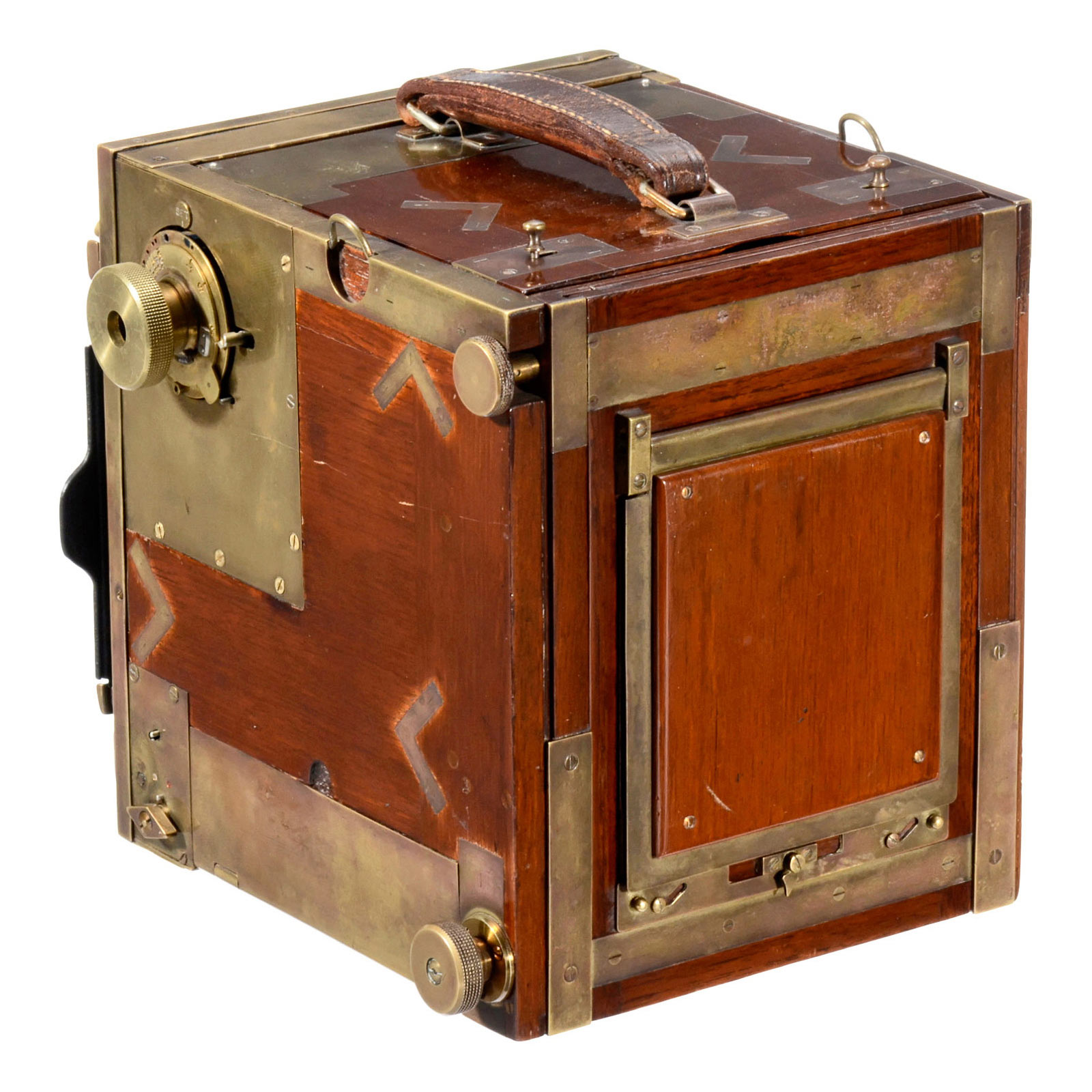 Adams & Co., London. Tropical SLR camera for plates of 4 x 5 in., teak with brass fittings, Zeiss Anastigmat 1:12,5 F = 260 mm, focal plane shutter 1/1000 sec. (working), dark-red bellows (corners with small holes), camera with original 6 x 9 cm cassette. – This rare camera in exceptional condition have brought 18.000 to 25.000 $ at Christie's auctions in 2002 and 2003! – Literature: McKeown's Price Guide 2005/06, p. 8.