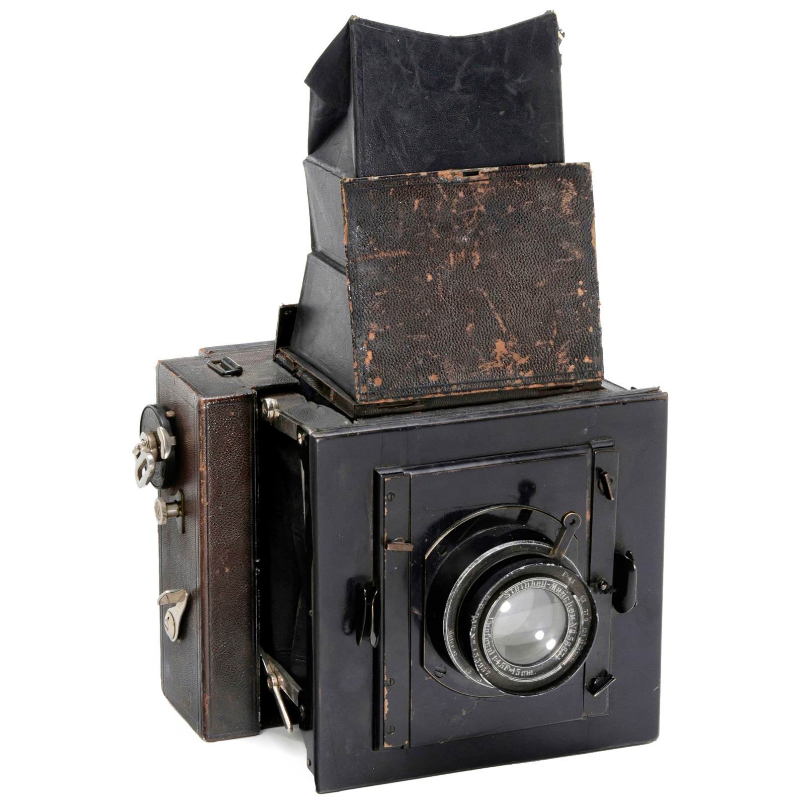 Contessa Camerawerk, Stuttgart. Forerunner of "Faltreflex" and "Miroflex" SLR cameras respectively. Plate size 9 x 12 cm, Steinheil lens Unofocal 4,5/15 cm, focal plane shutter "Deck-Rullo Nettel". Only produced for a short time. – One of the rarest SLR cameras by Contessa!