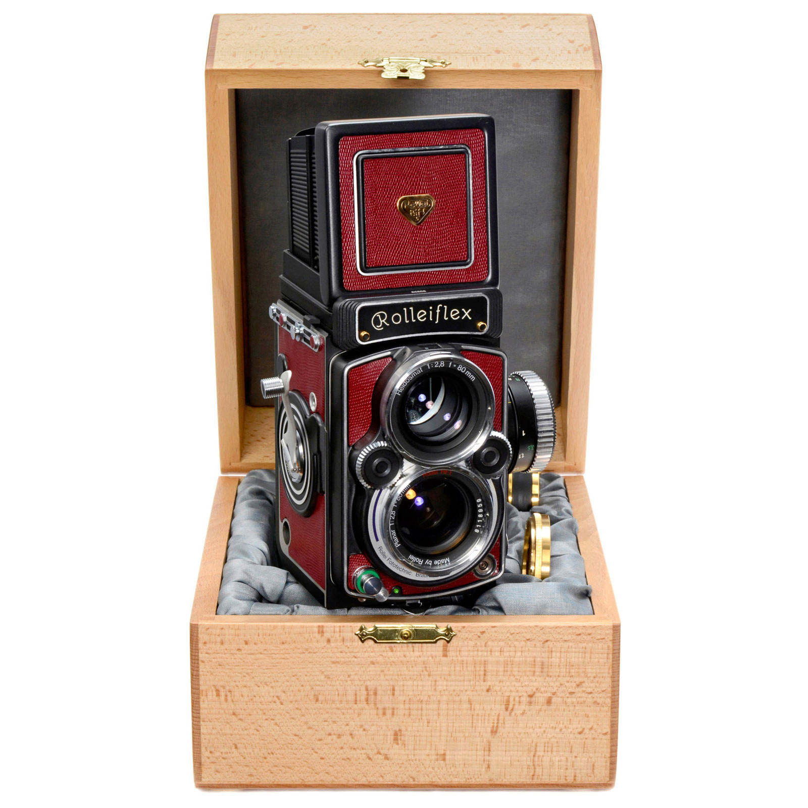 Ian Parker's Jersey Camera, no. 80808. Luxury special edition of Rolleiflex 2,8 GX, only 100 cameras produced, with red leather, massive golden applications and fittings. With Rolleinar 2 (gold), wooden case, box, 2 Rollei books signed by Ian Parker.
