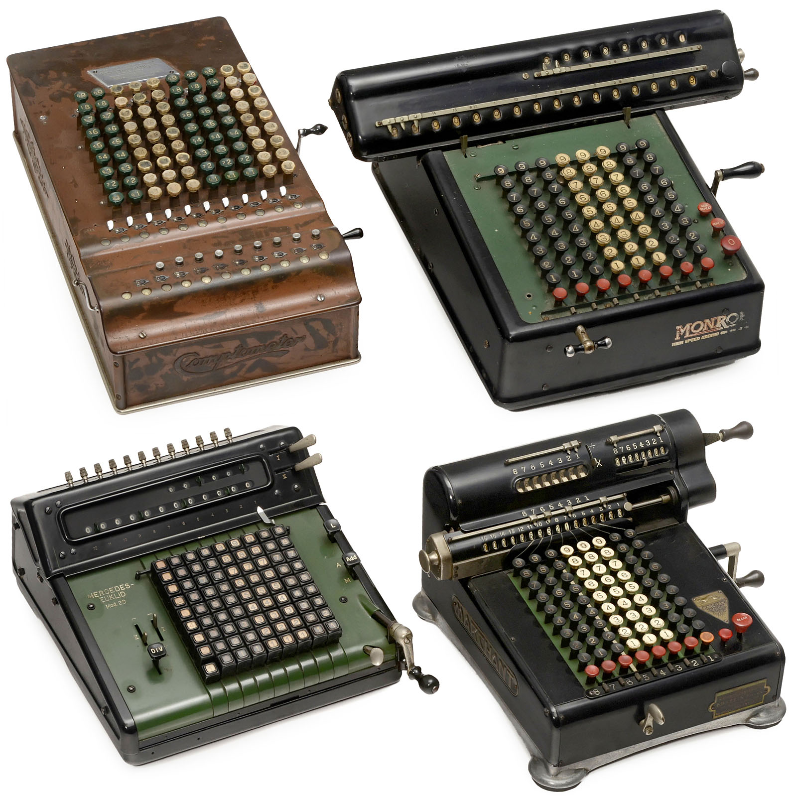 1) Marchant Mod. H8, 1923. – 2) Mercedes Euklid Mod. 29, 1934. – 3) Comptometer Mod. JS, 1926. – And: 4) Monroe Mod. K, 1915.