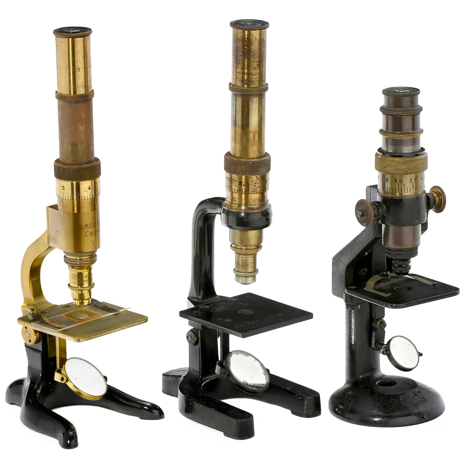 2 by Schütz A.G., 1 by Buschow, Cassel. Original lacquered brass, iron feet, single mirrors, tilting stands, micrometer screw fine adjustment to the tubes. 1 with case.