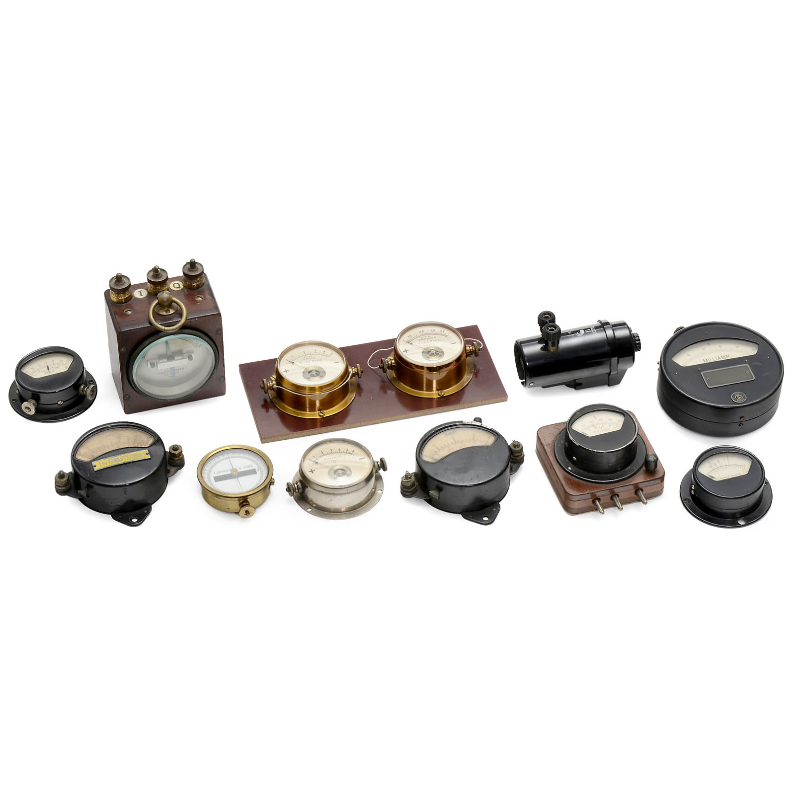 1) Needle galvanometer by Leopolder & Sohn, c. 1900. – 2) Voltmeter and amperemeter by Morlot Maury, Paris, c. 1910. – 3) Aerial voltmeter by Telefunken, c. 1916. – 4) Needle galvanometer by Edison & Swan, c. 1918. – And: 5–11) 6 further instruments.