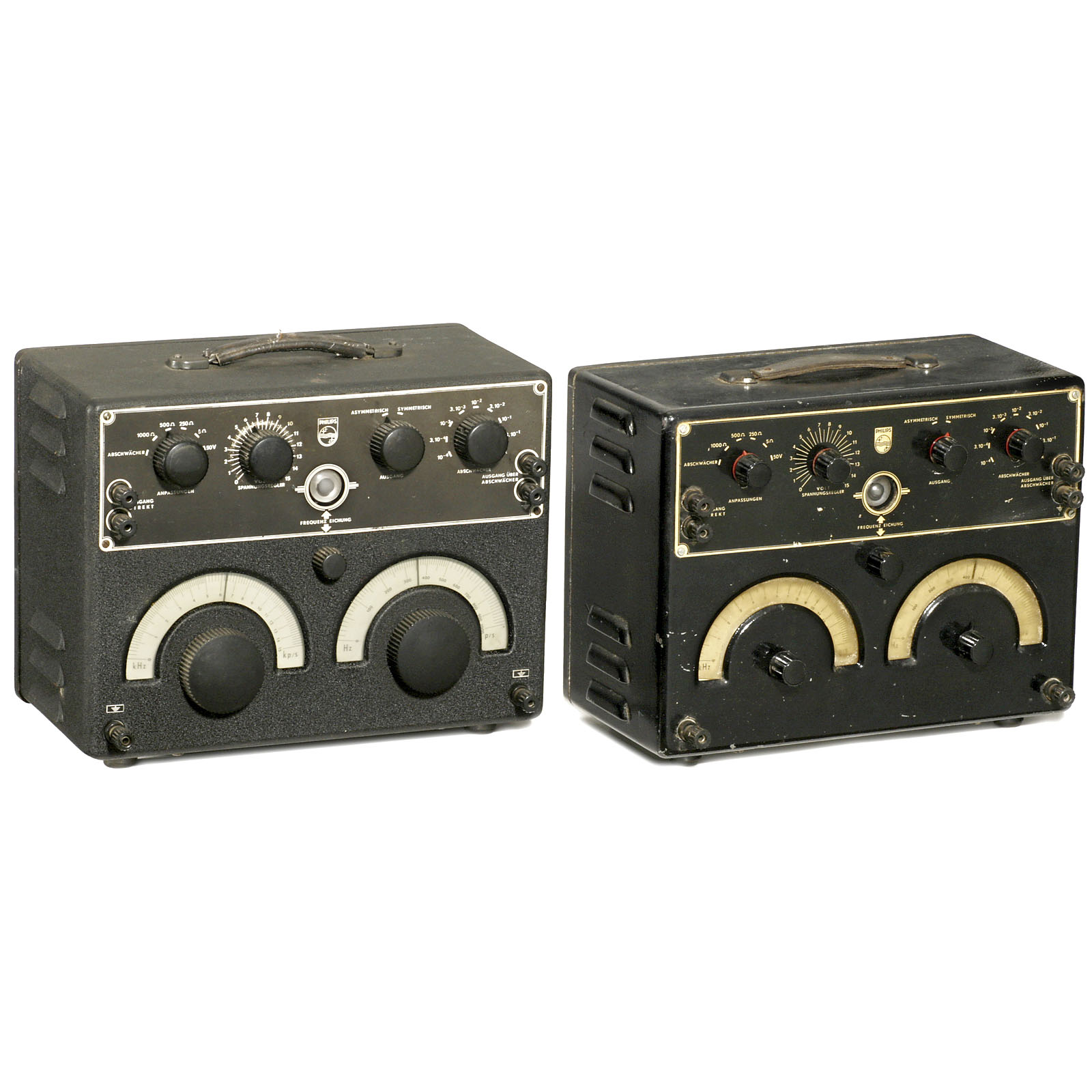 1) Telefunken stabilized power supply type MS/NG 571/1, not complete. – 2) 2 Philips audio frequency oscillators type GM 2307 (various models). – 3) Wandel & Goldmann winding counter W2L 181 with testing unit. – 4) TV-FM Genescope by Simpson Electric Co., Chicago. – 5) EMI oscilloscope, type WM4, England. – 6) HAM oscilloscope, type LBO-310, Japan. – 7) T.L. Henke, type WO 512b, Germany. – And: 8) R-C-L measuring bridge by Metrohm AG, Switzerland.