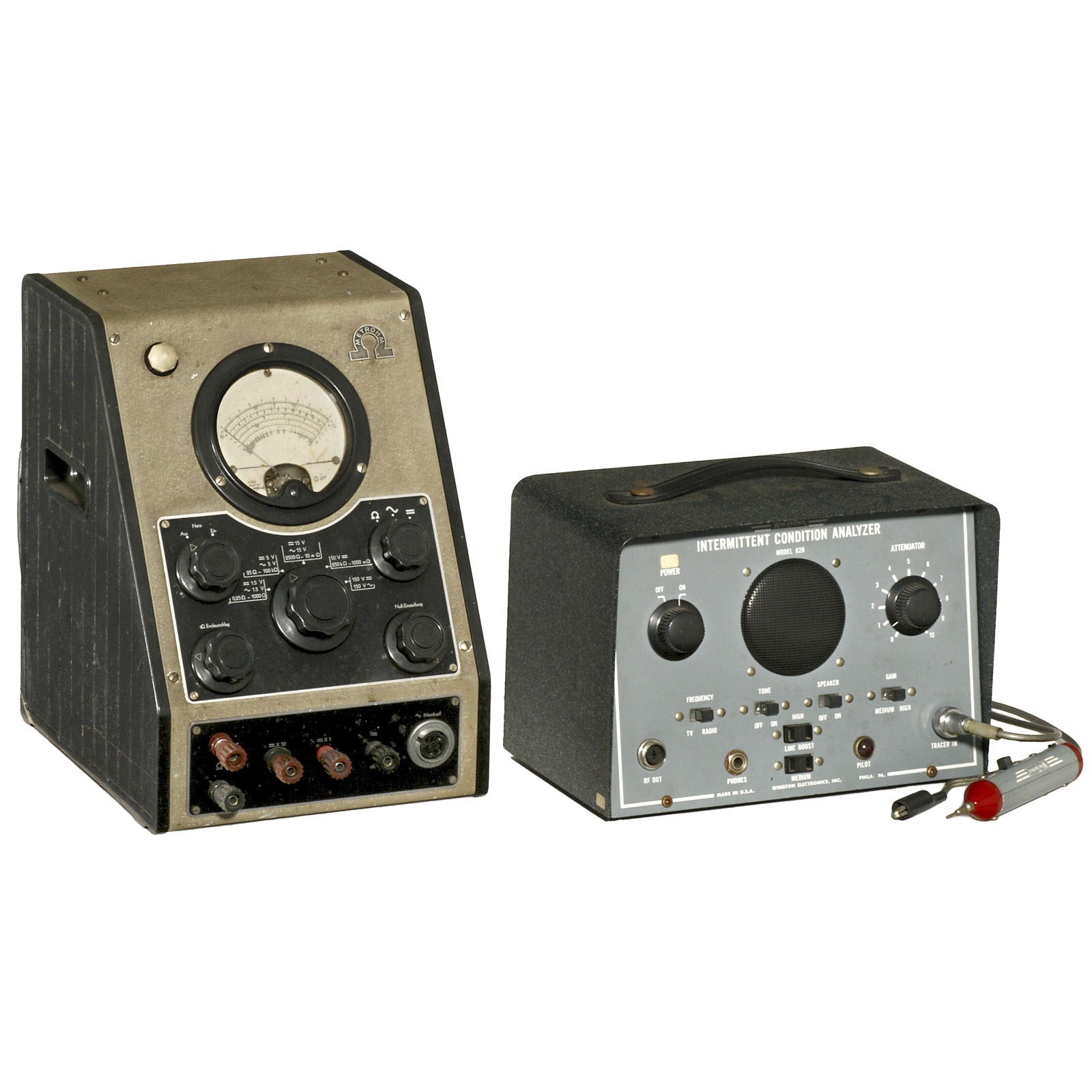 1) Solatron double-beam oscilloscope CD 1400. – 2) Schwachstrom-Technik A.G. – Zürich. Tone generator type A1112 and test transmitter type 1310. – 3) Test transmitter Supersonic B-45, France. – 4) Test transmitter EP 104 BS, Neuwirth/Hanover. – 5) Metrohm tube voltmeter type MB 46. – 6) Win-Tronic Intermittet Condition Analyzer Model 828. – 7) Highly sensitive measuring instrument by Leeds & Northrup. – And: 8) Volt- and ampere meter by Service Standard, Paris.