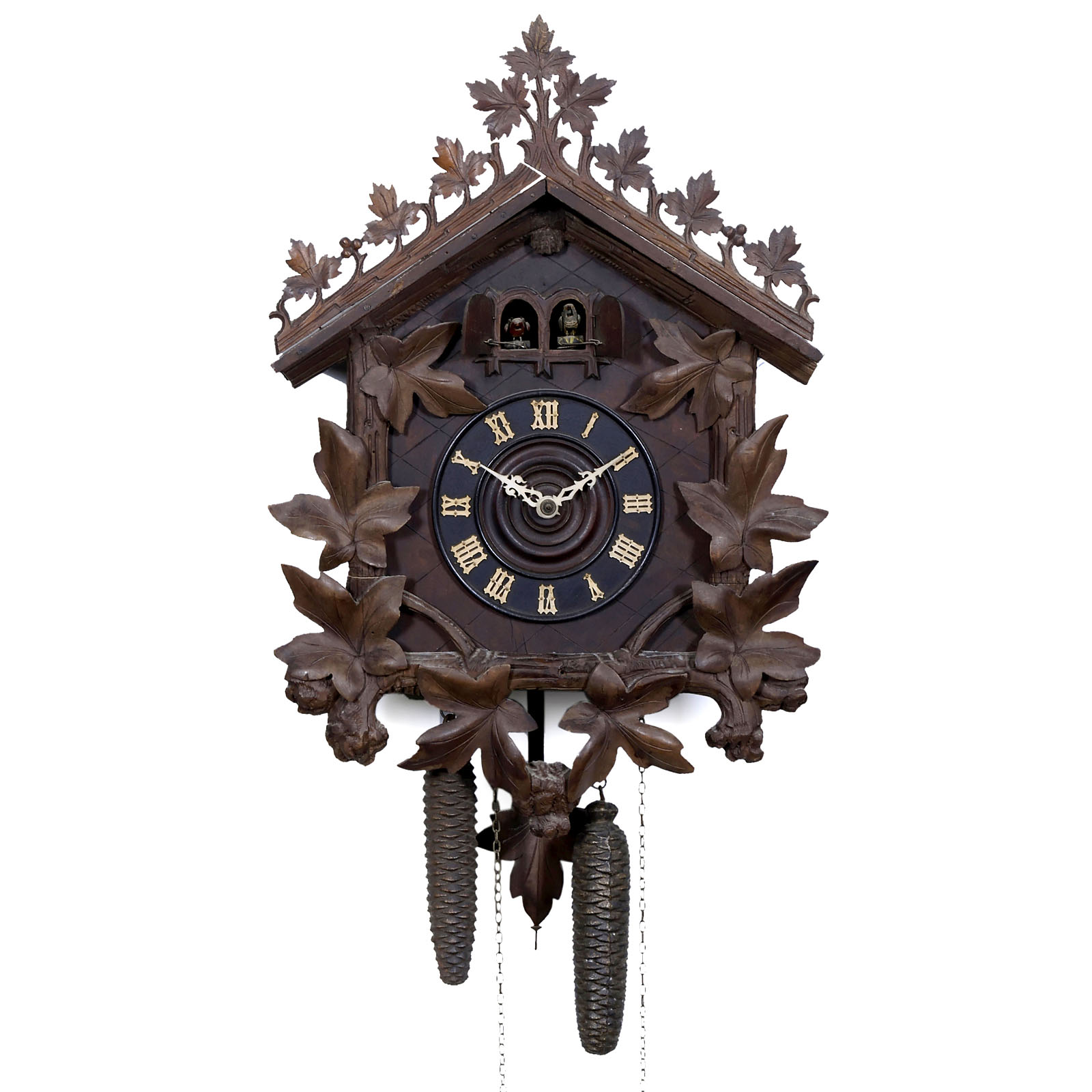 1) Large clock with cuckoo and quail, with 2 pipes each, carved leaf decoration, bone hands, with weights. – And: 2) Small clock, cuckoo call and strike on spiral gong, no weights.