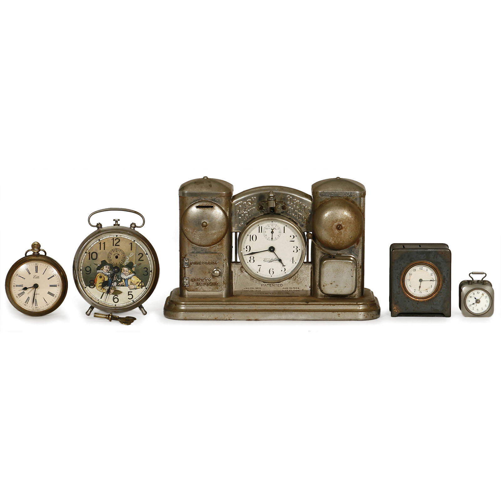 1) Small cube-shaped travel alarm clock, marked on the reverse "Made in Germany". – 2) Alarm clock with dice game, missing alarm hand. – 3) Money bank alarm clock. – 4) Eble quartz clock. – And: 5) Flash Light Electric Alarm by "Darche Mfg, USA". – All movements untested.